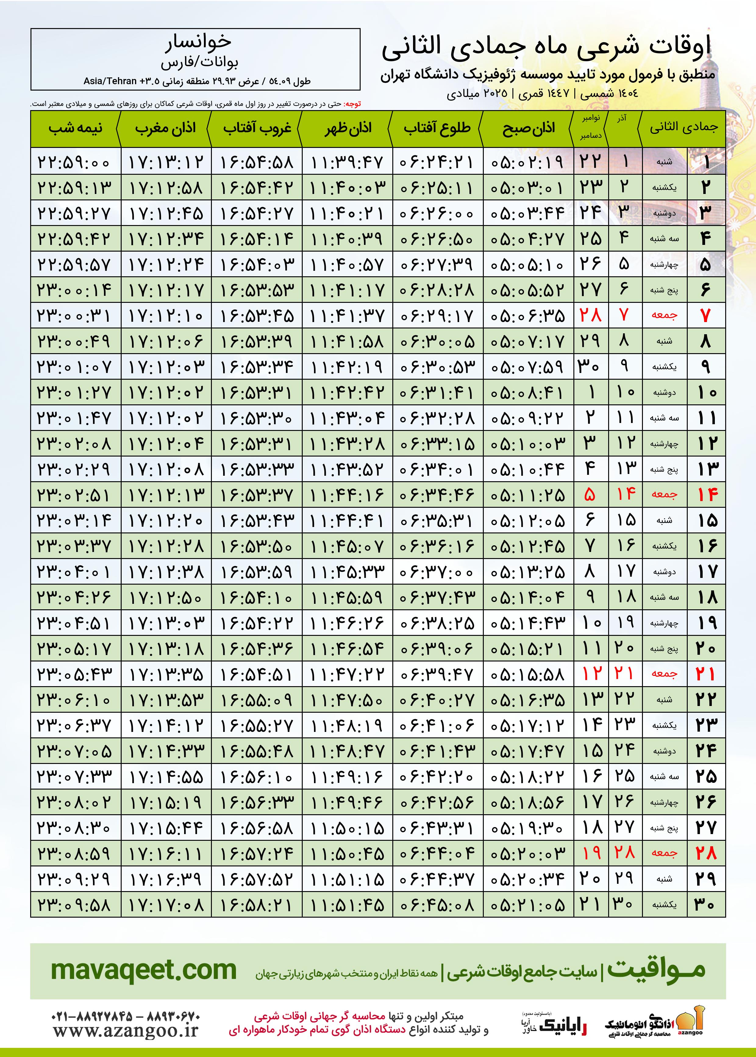 اوقات شرعی ماه جمادی الثانی ١٤٤٧ هـ.ق شهر خوانسار بر