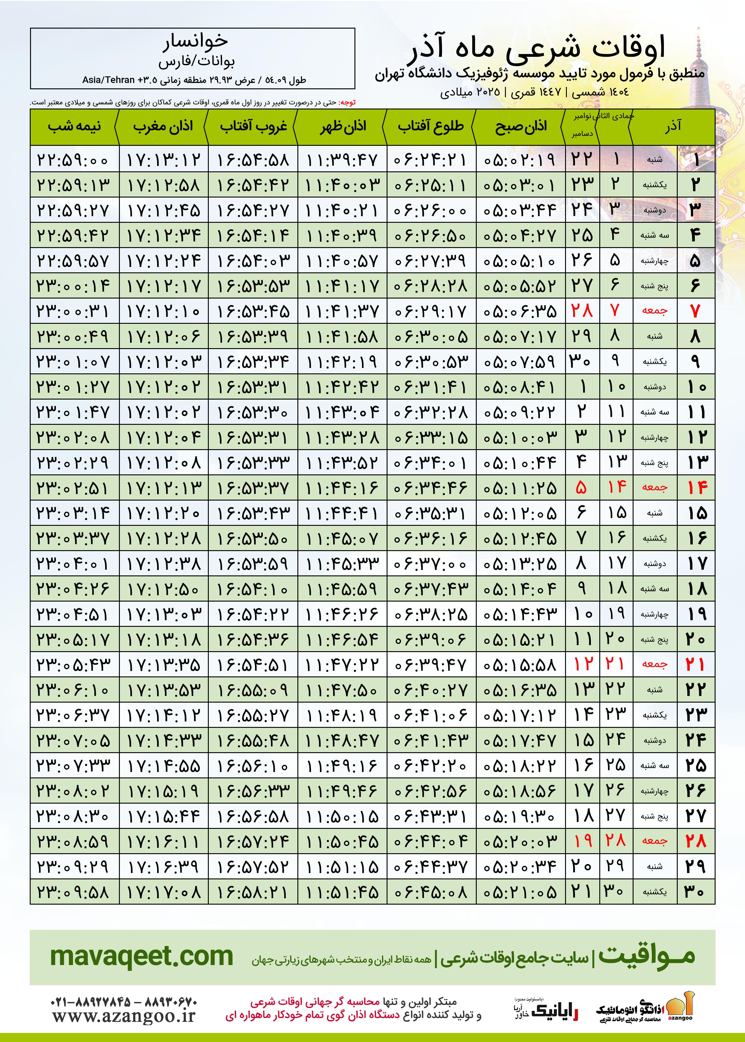 دانلود اوقات شرعی آذر ٠٤ - ١٤٠٤ شهر خوانسار