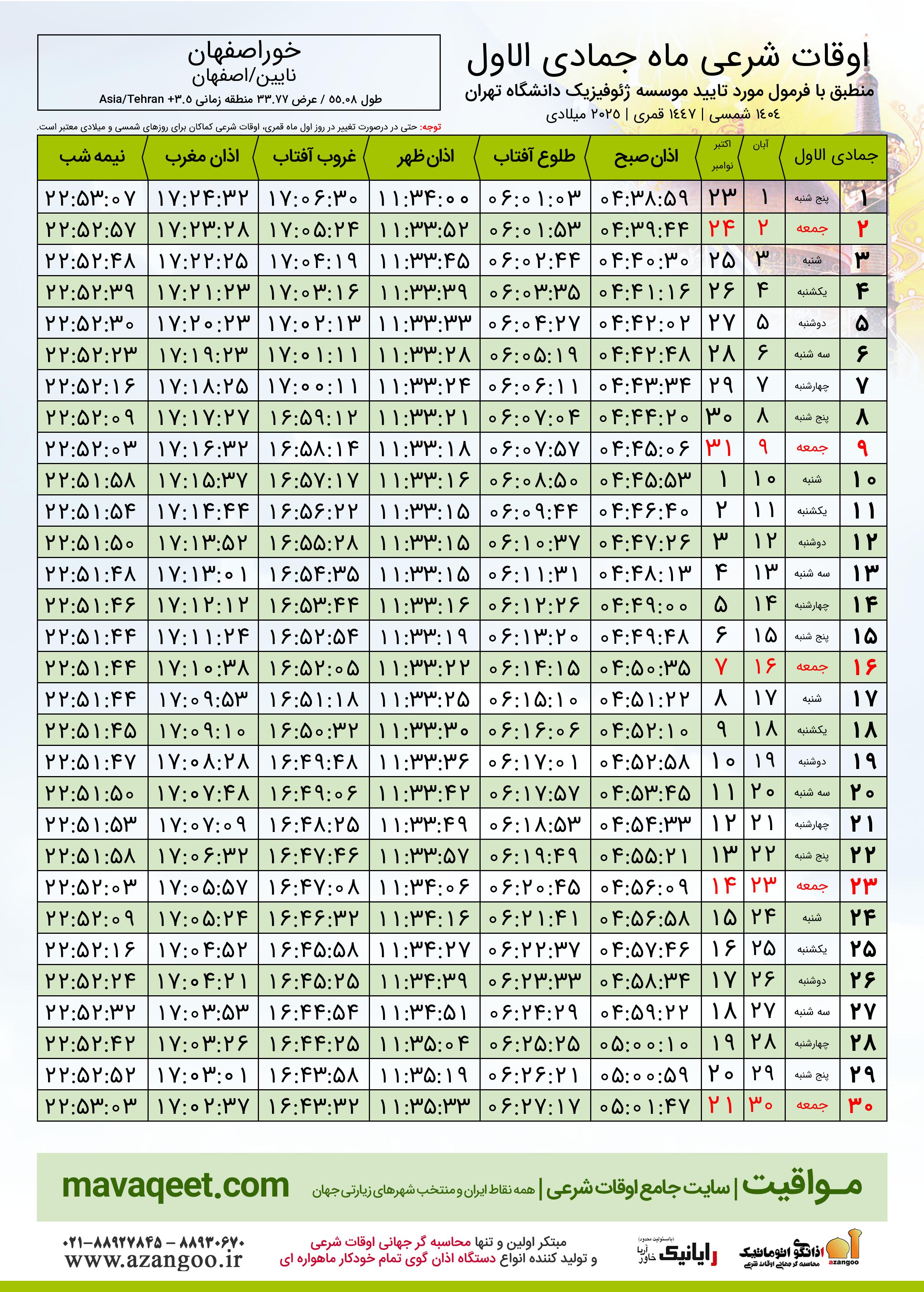 جدول اوقات شرعی جمادی الاول ١٤٤٧ قمری شهر خوراصفهان