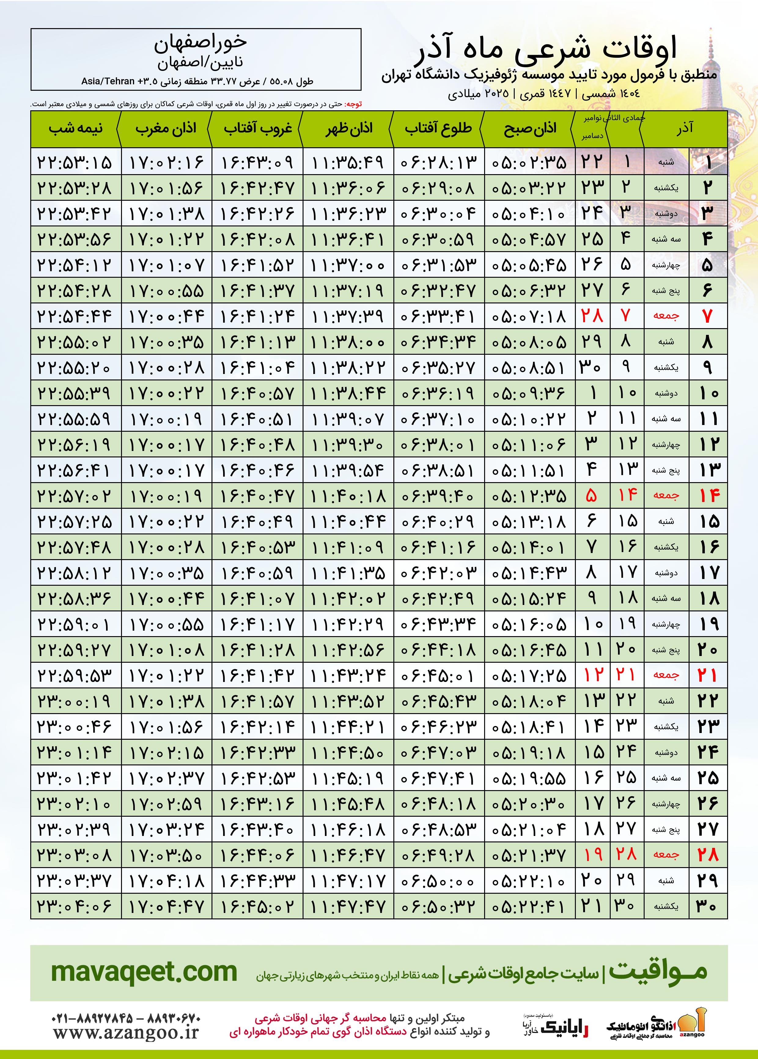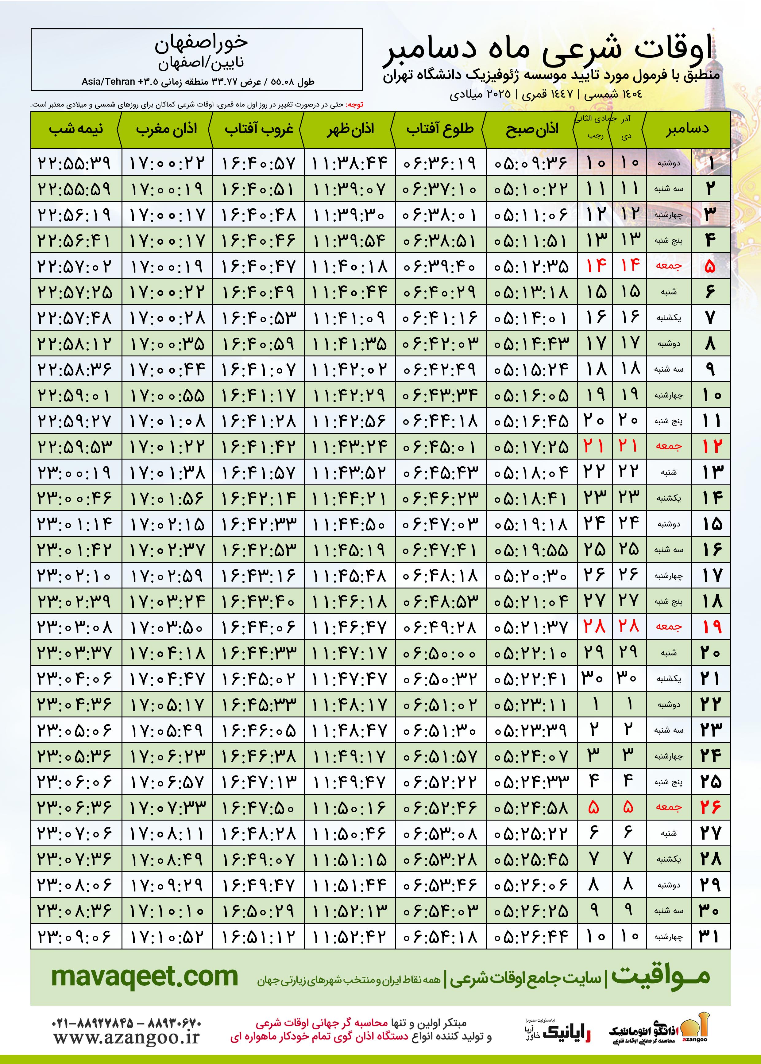 جدول اوقات شرعی آذر ١٤٠٤ شمسی شهر خوراصفهان