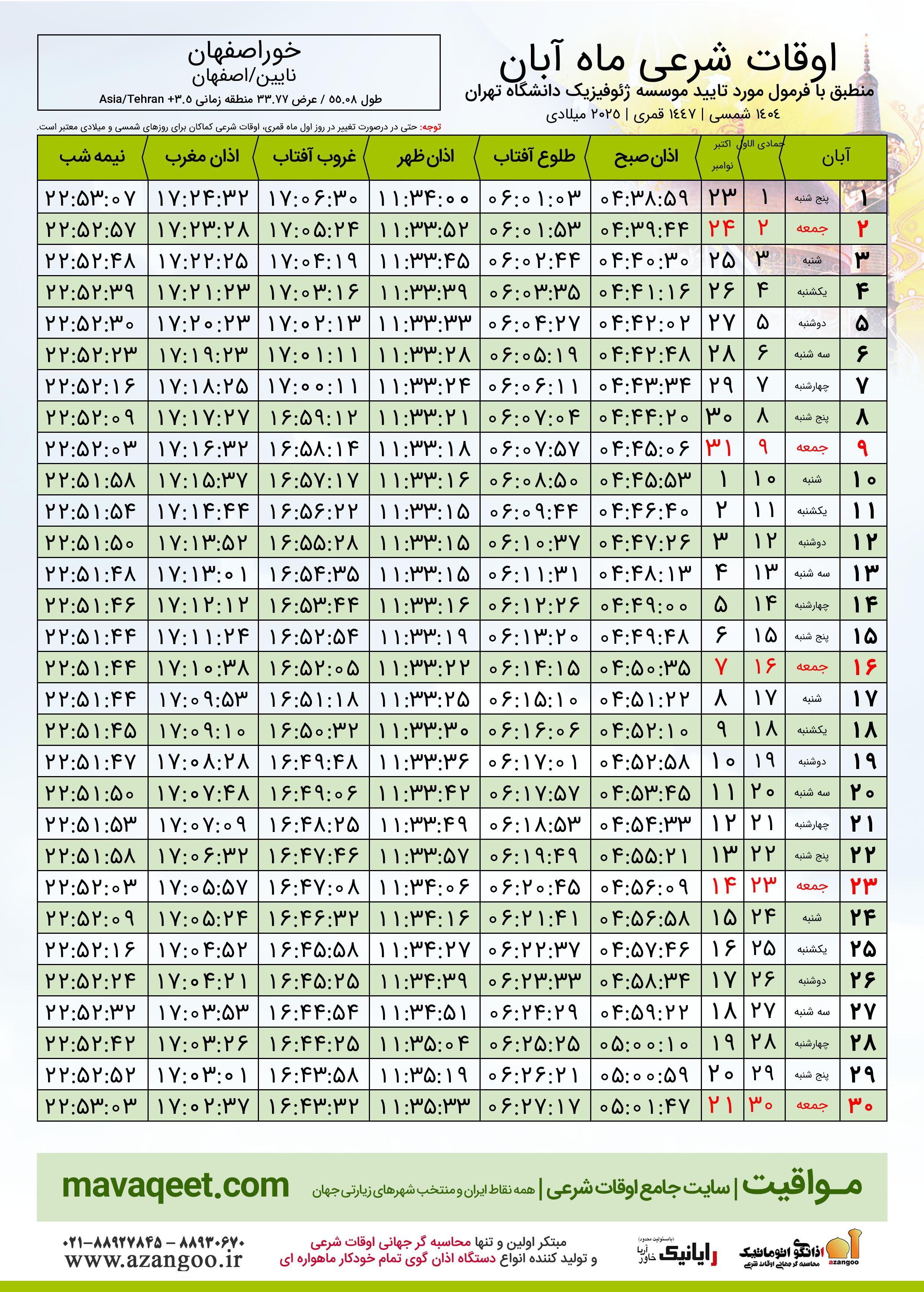 جدول اوقات شرعی آبان ١٤٠٤ شمسی شهر خوراصفهان