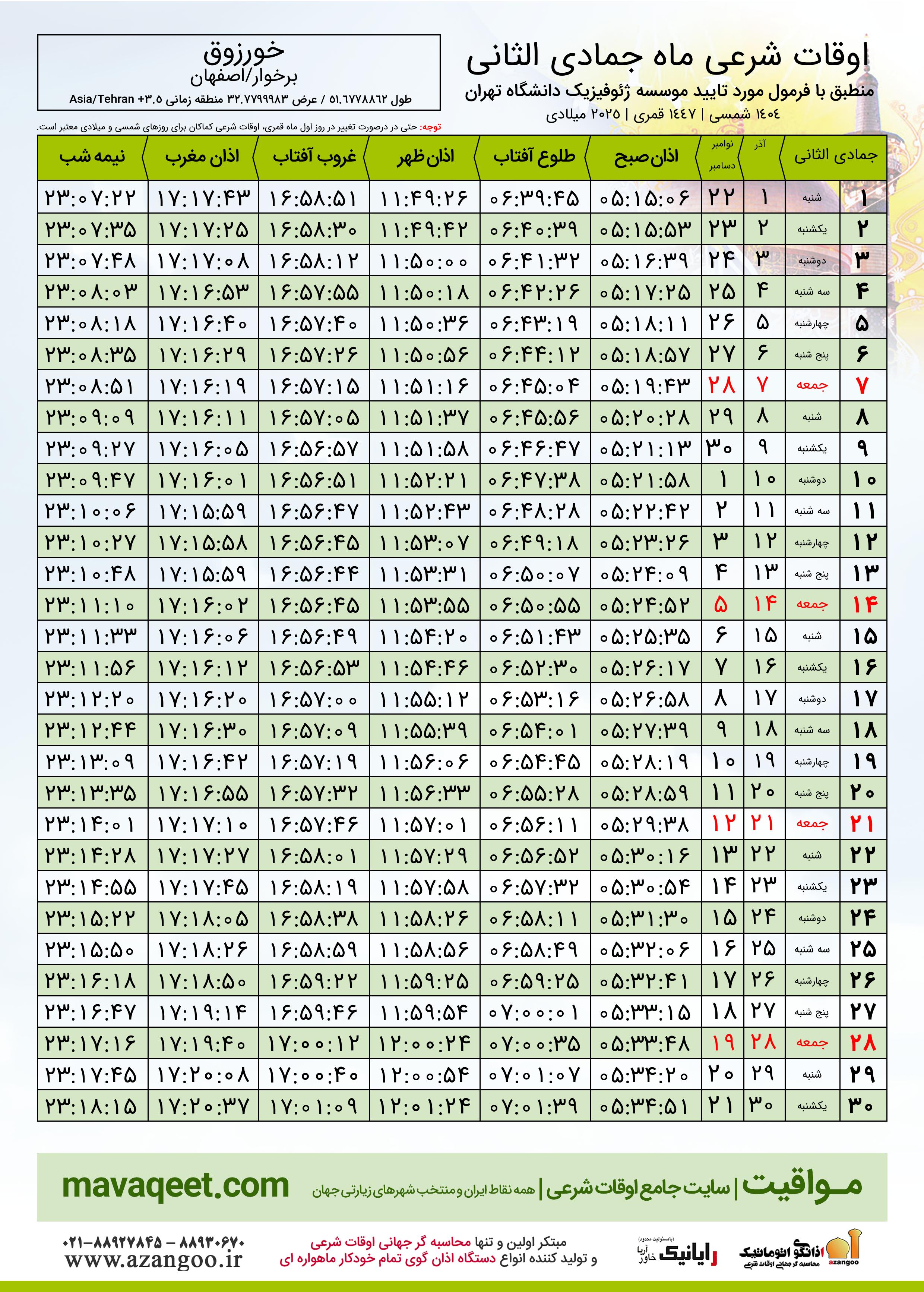 اوقات شرعی ماه جمادی الثانی ١٤٤٧ هـ.ق شهر خورزوق بر
