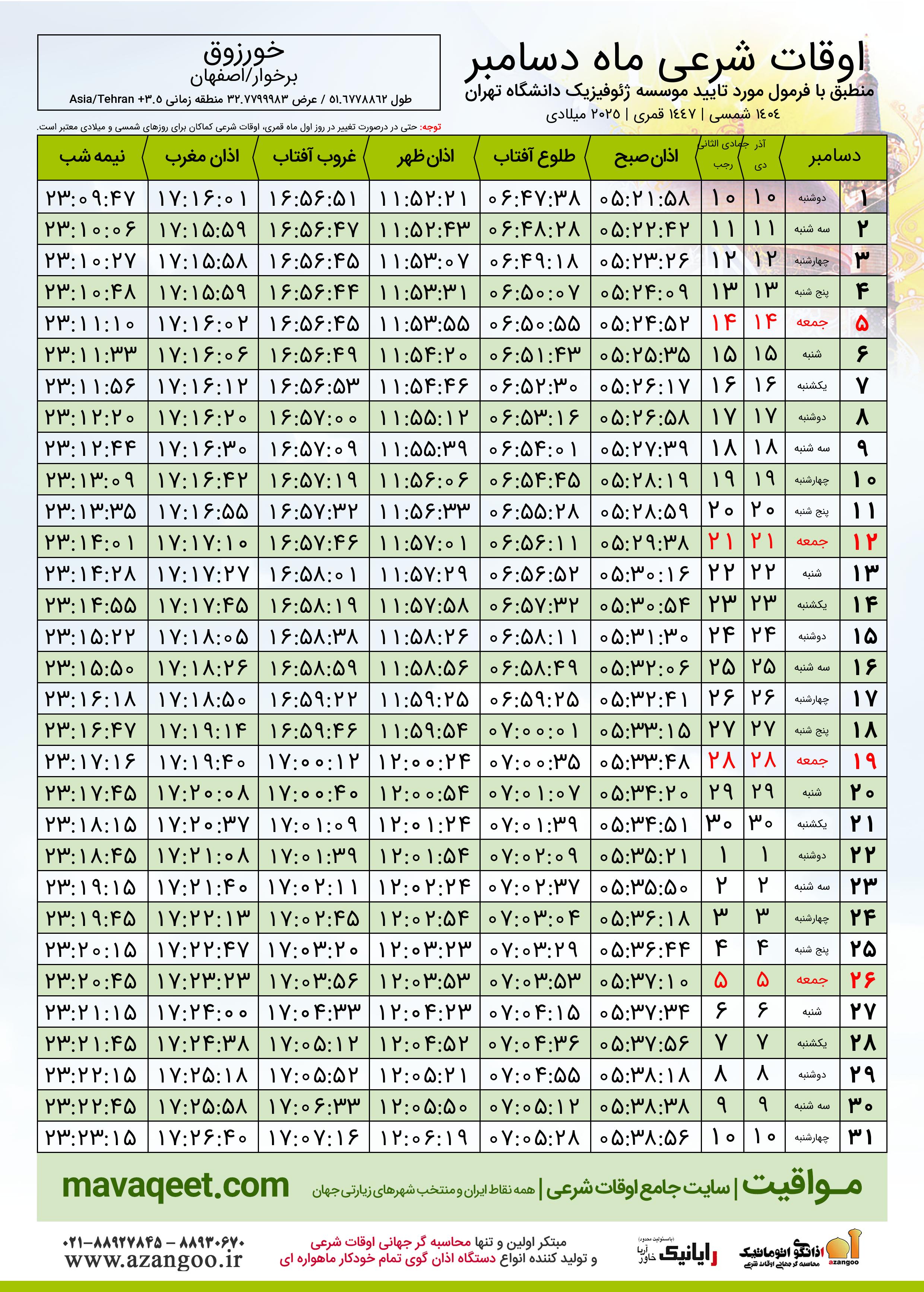 دانلود اوقات شرعی دسامبر ٢٠٢٥ شهر خورزوق