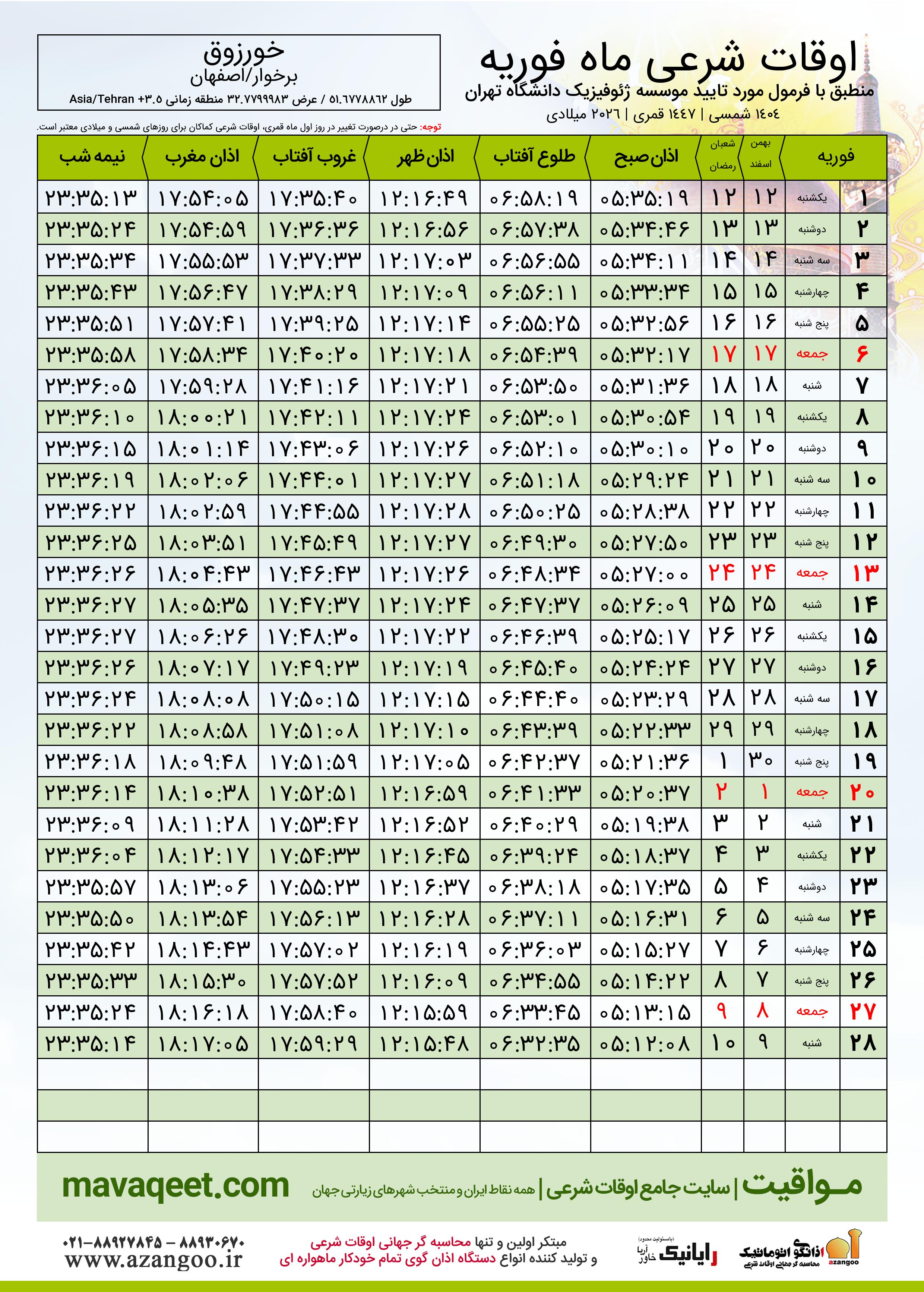 اوقات شرعی شعبان ١٤٤٧ قمری شهر خورزوق