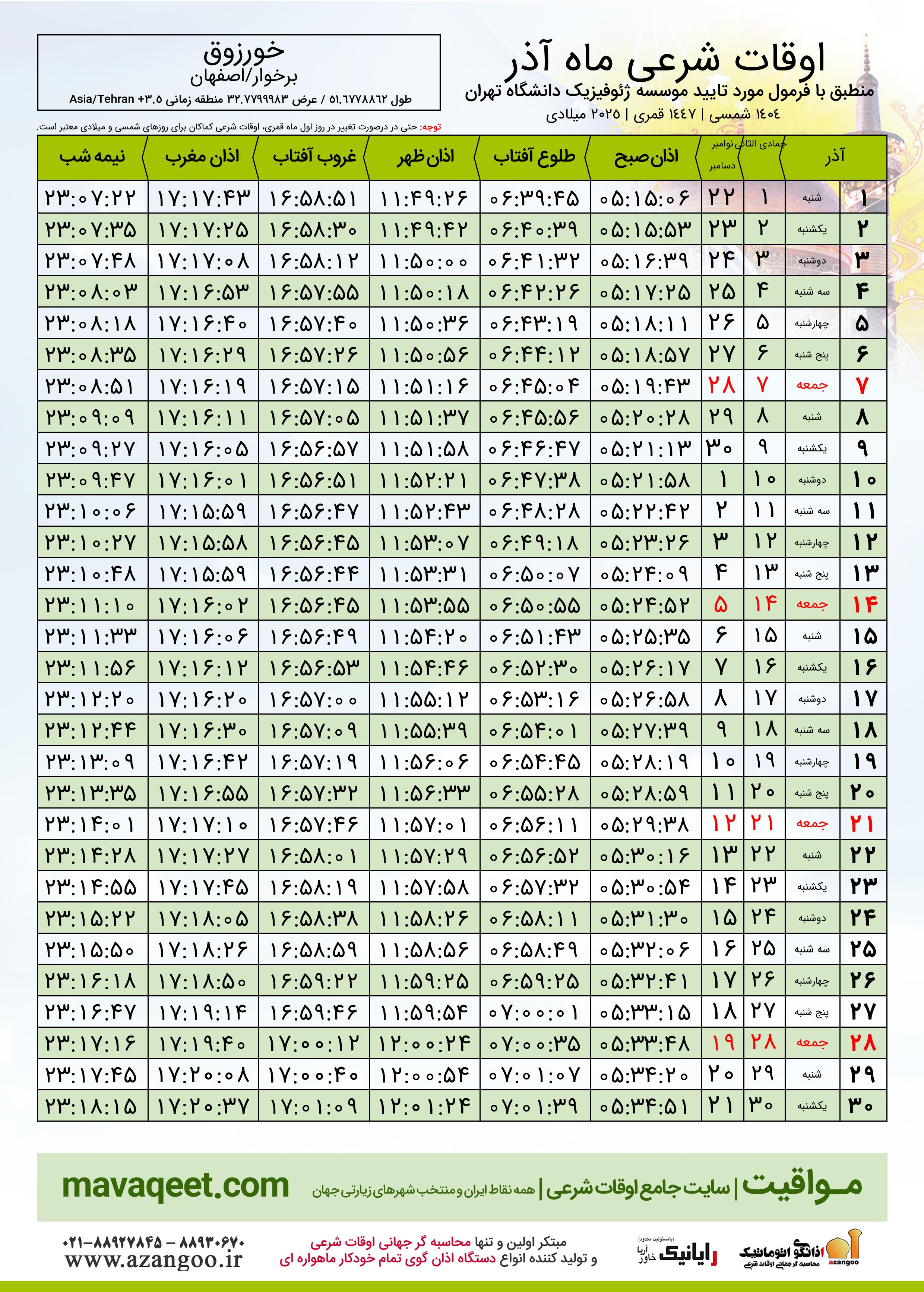 اوقات شرعی آذر ١٤٠٤ شمسی شهر خورزوق