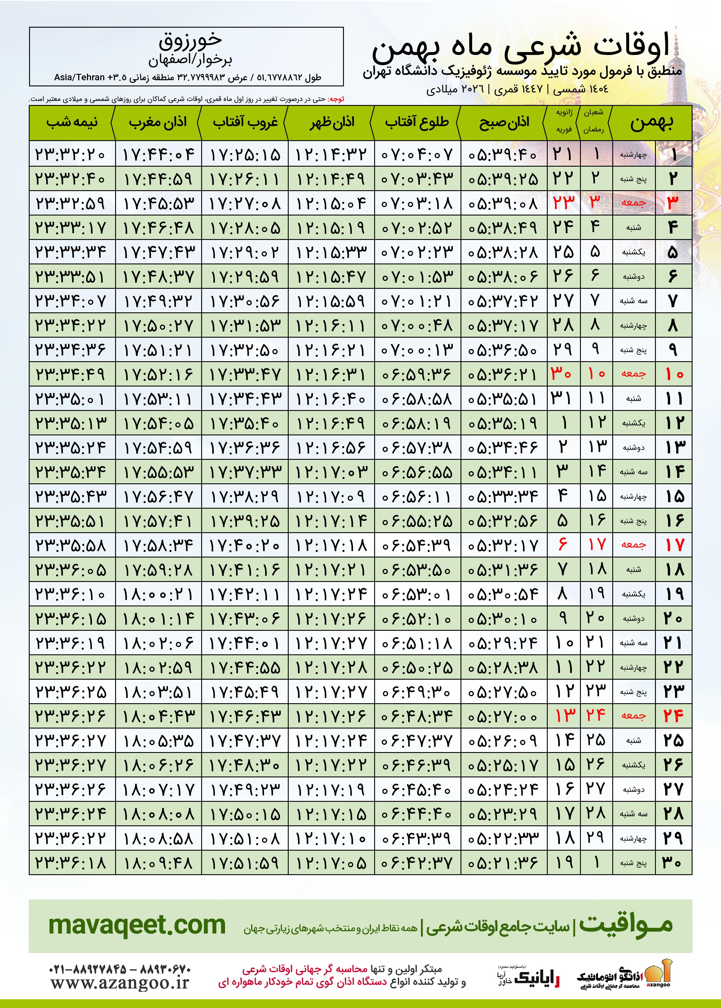 دانلود اوقات شرعی بهمن ٠٤ - ١٤٠٤ شهر خورزوق