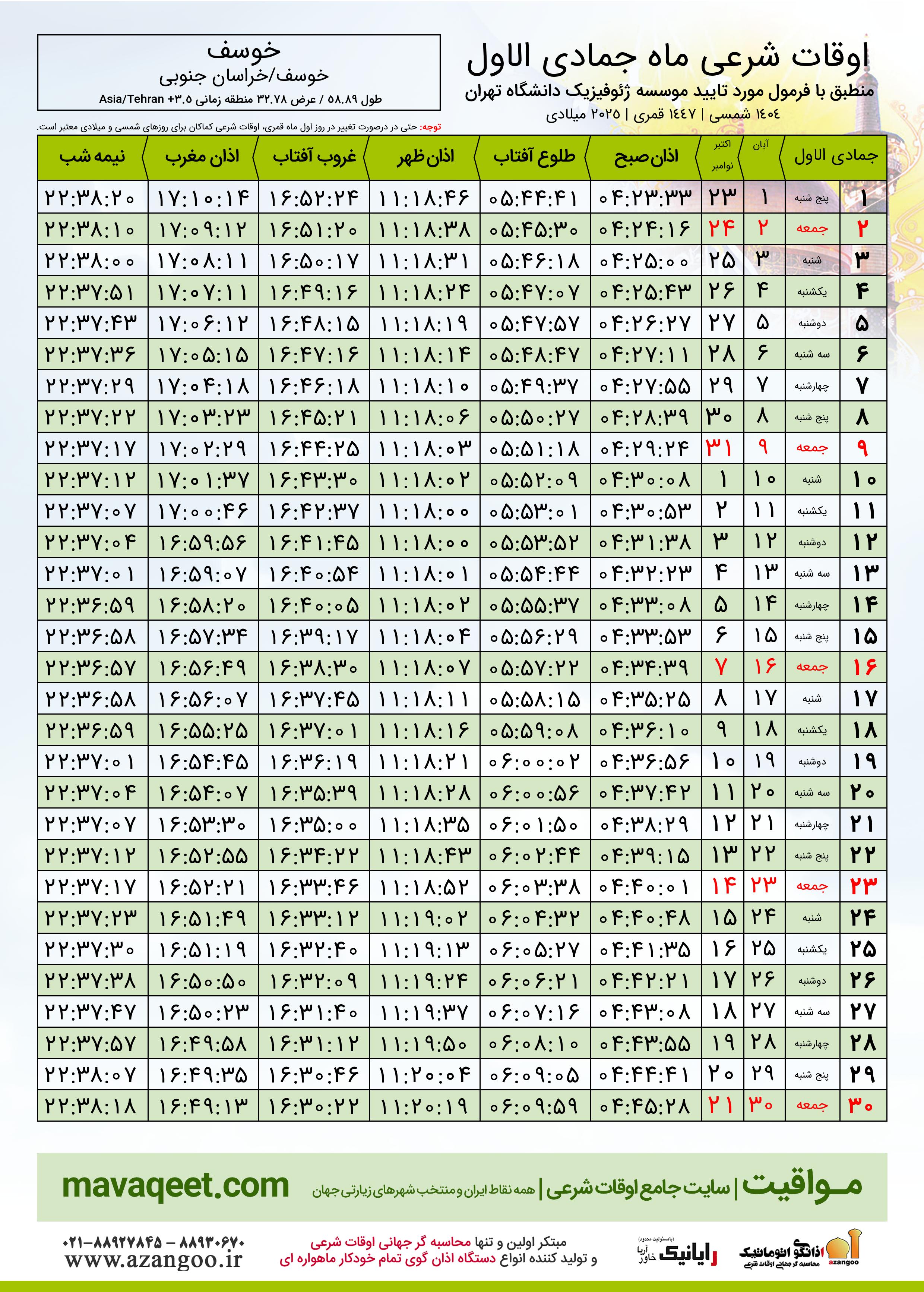 جدول اوقات شرعی جمادی الاول ١٤٤٧ قمری شهر خوسف