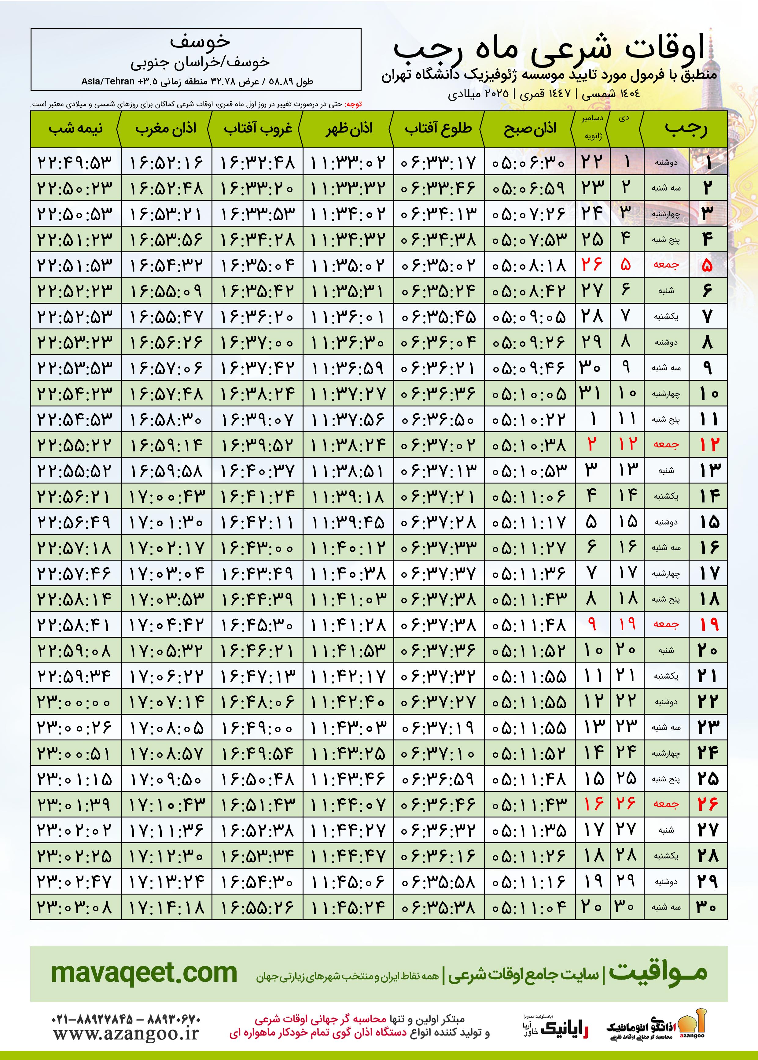 اوقات شرعی ماه رجب ١٤٤٧ هـ.ق شهر خوسف بر
