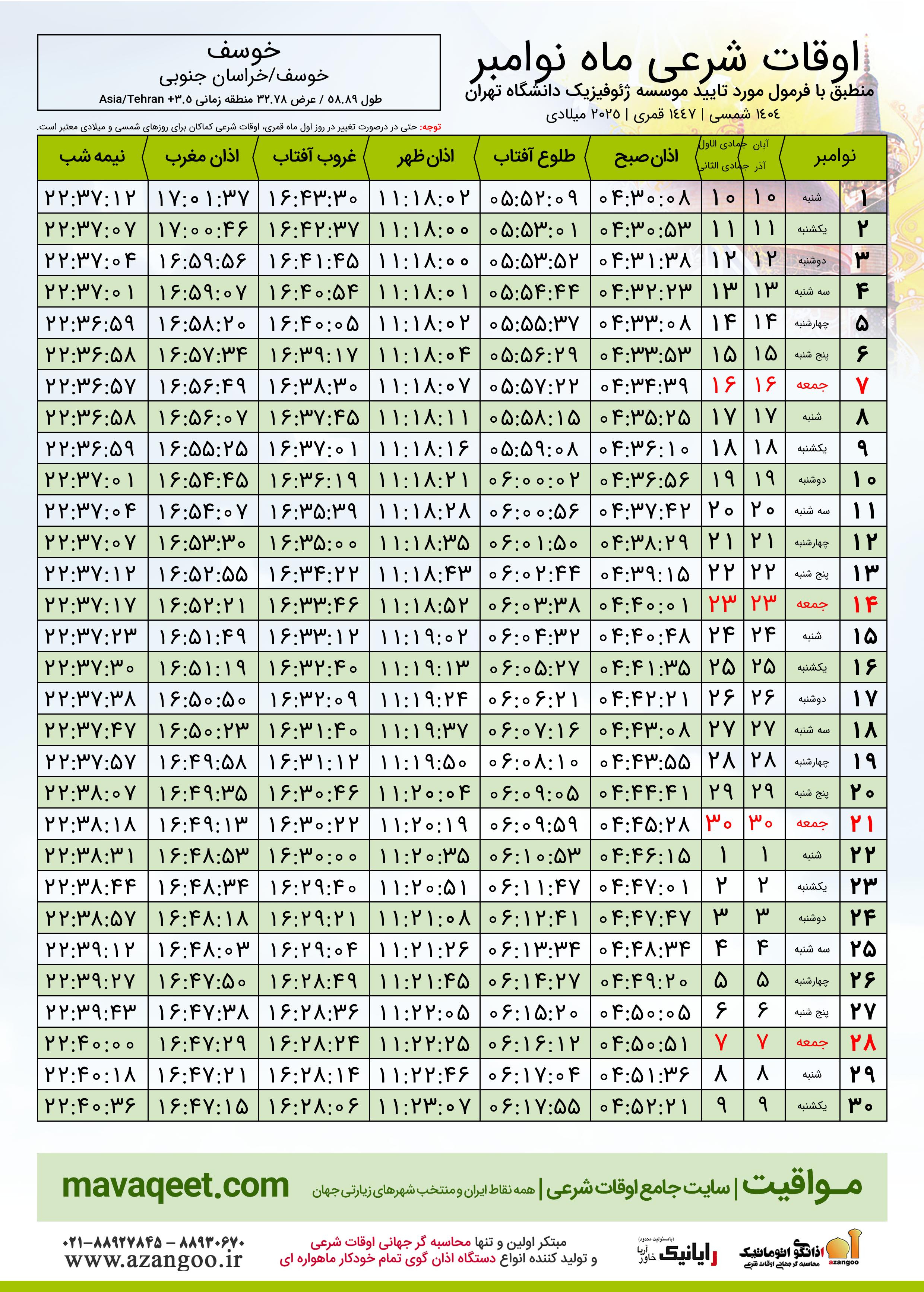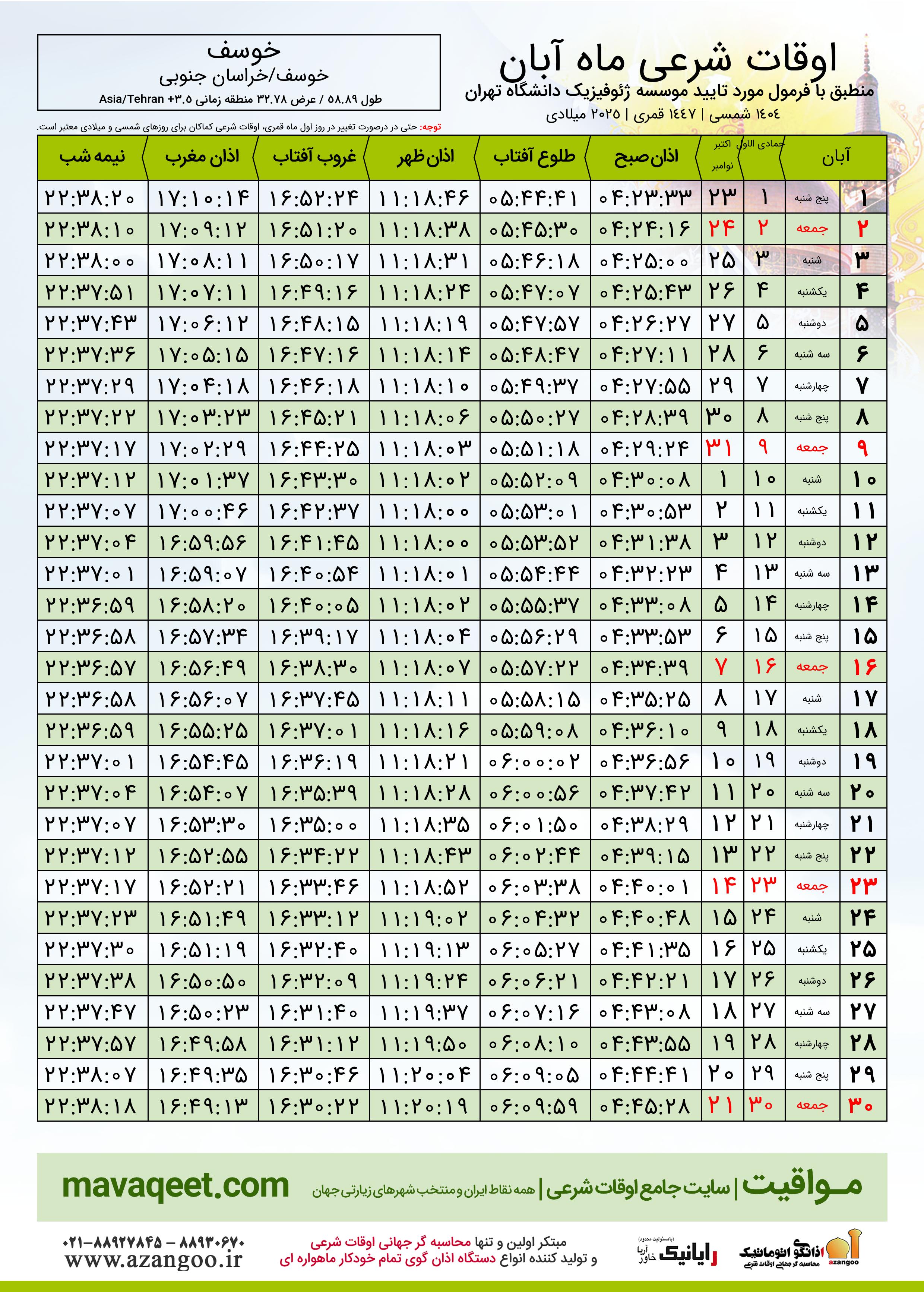اوقات شرعی آبان ١٤٠٤ شمسی شهر خوسف