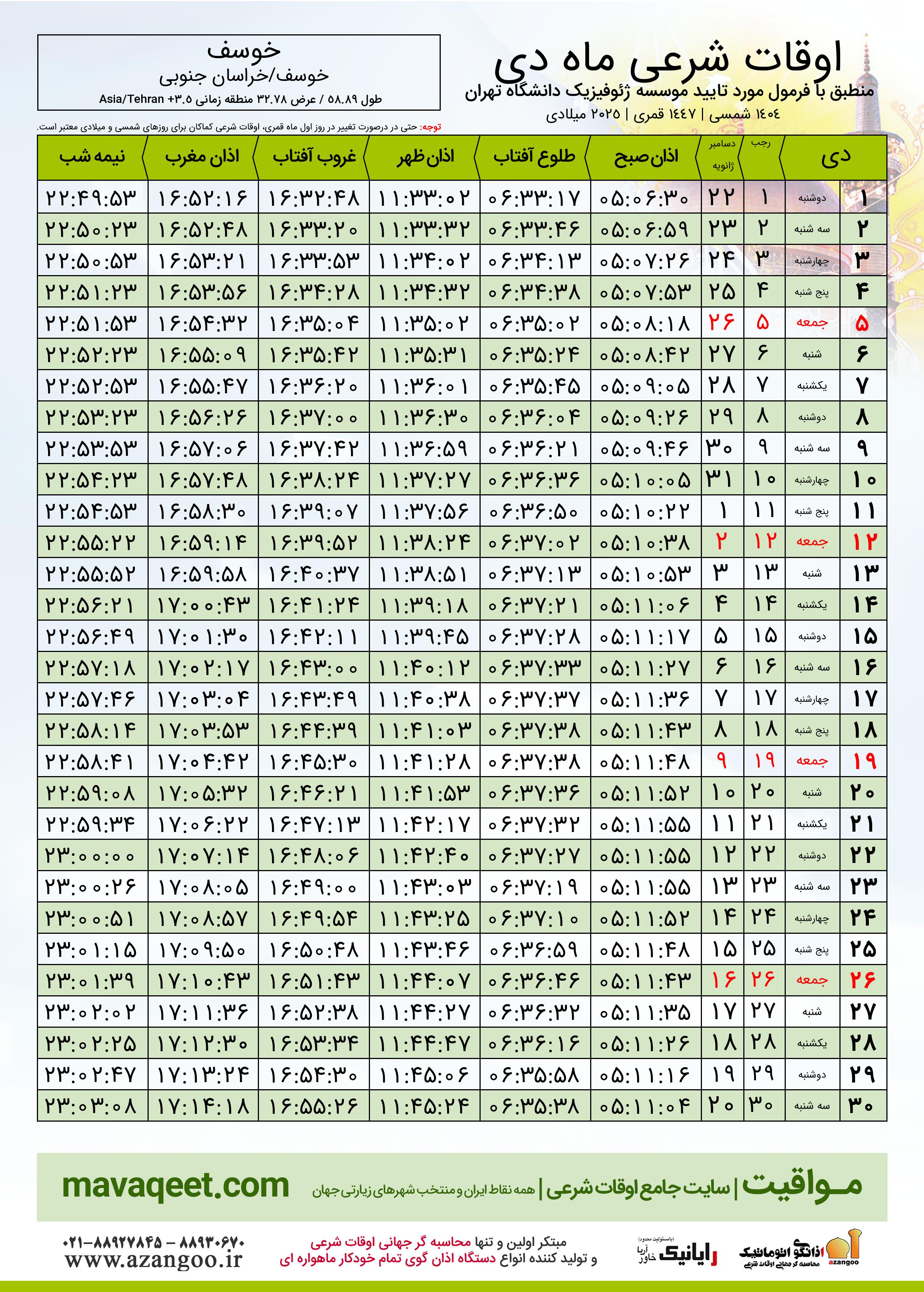 اوقات شرعی دی ١٤٠٤ شمسی شهر خوسف