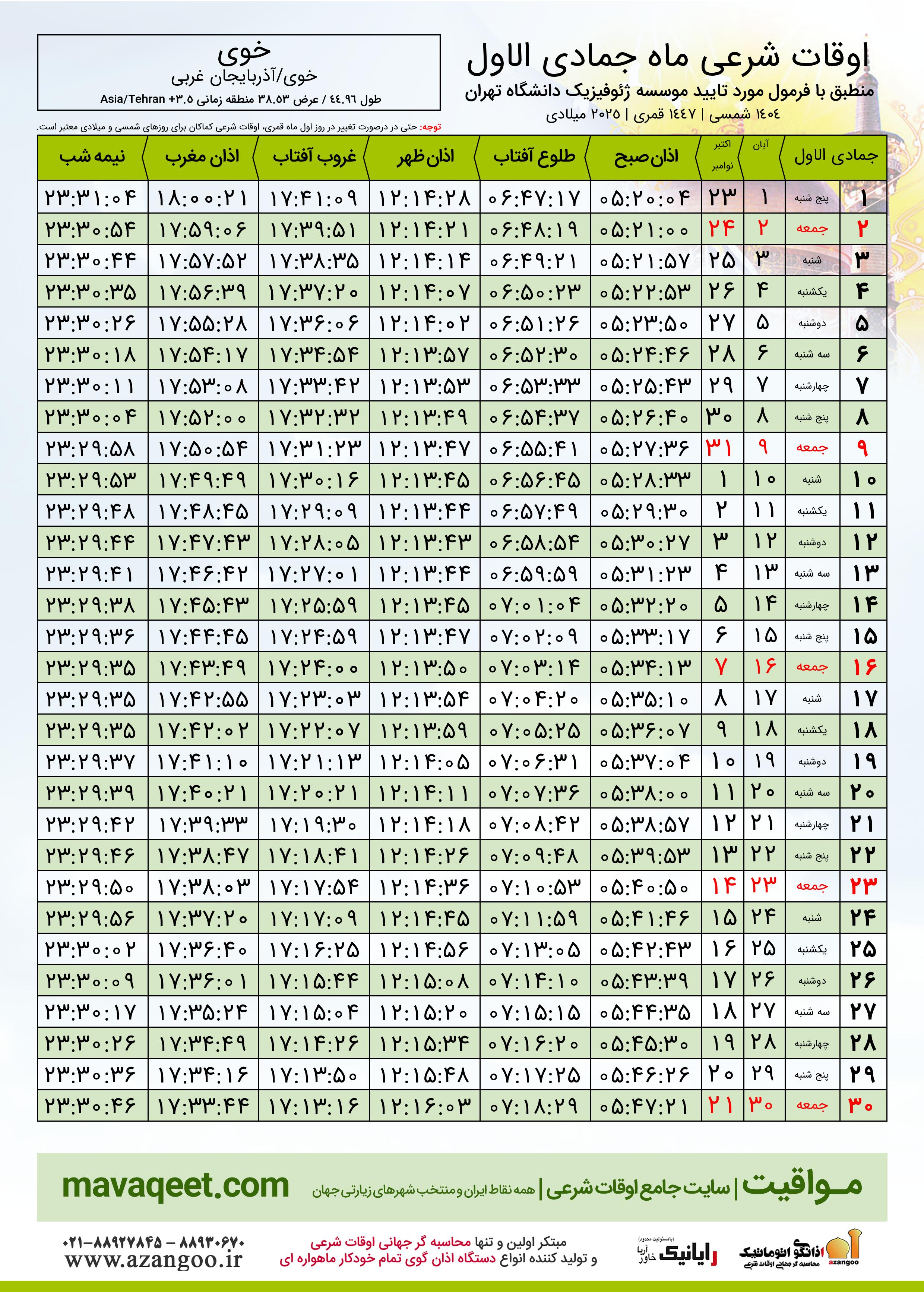 جدول اوقات شرعی جمادی الاول ١٤٤٧ قمری شهر خوی