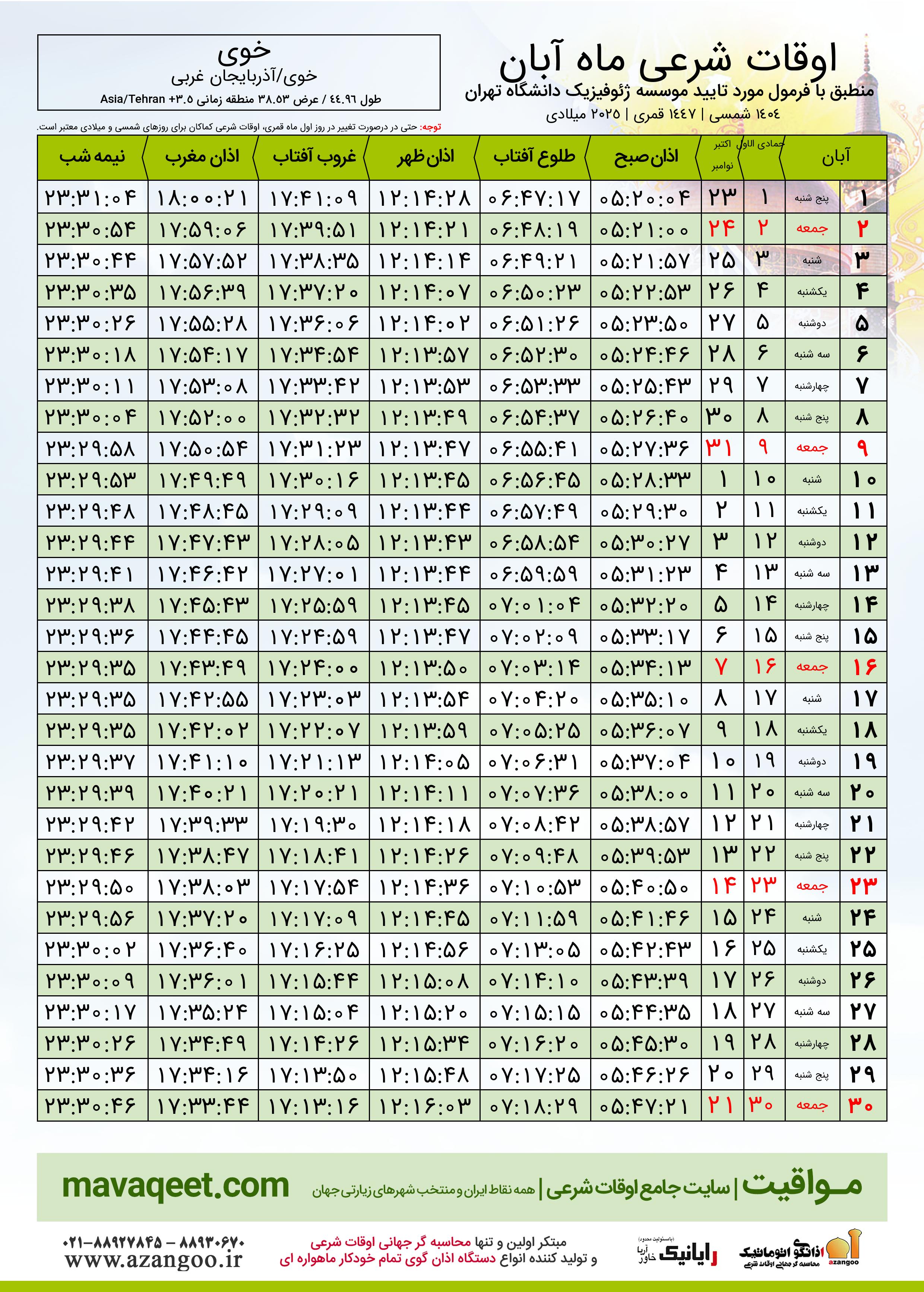 اوقات شرعی آبان ١٤٠٤ شمسی شهر خوی