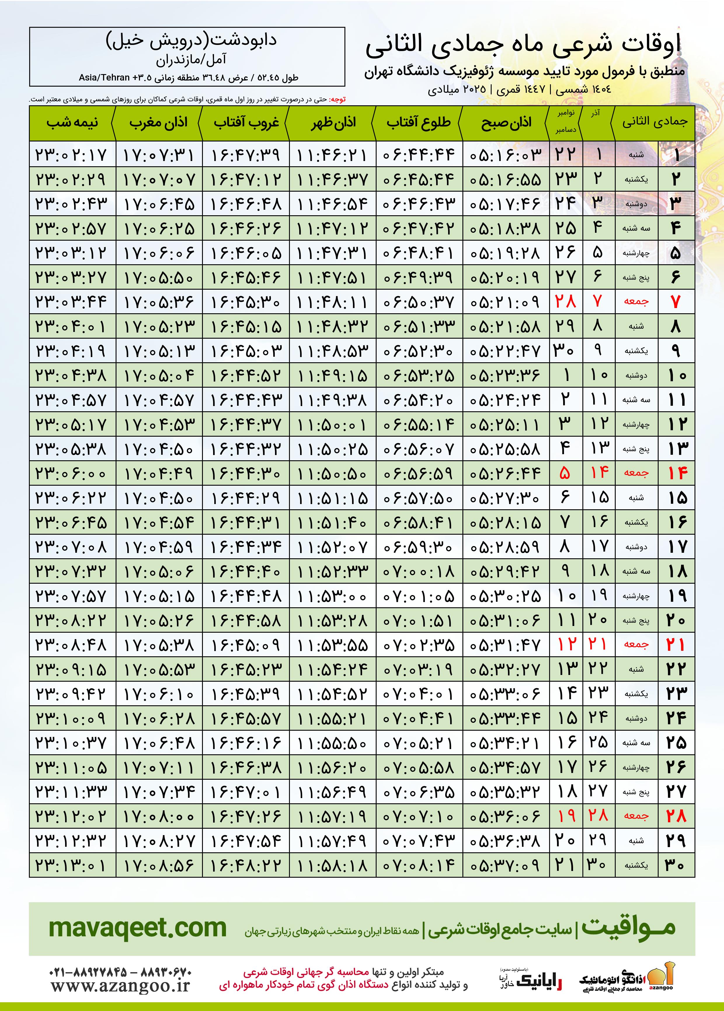 جدول اوقات شرعی جمادی الثانی ١٤٤٧ قمری شهر دابودشت(درویش خیل)
