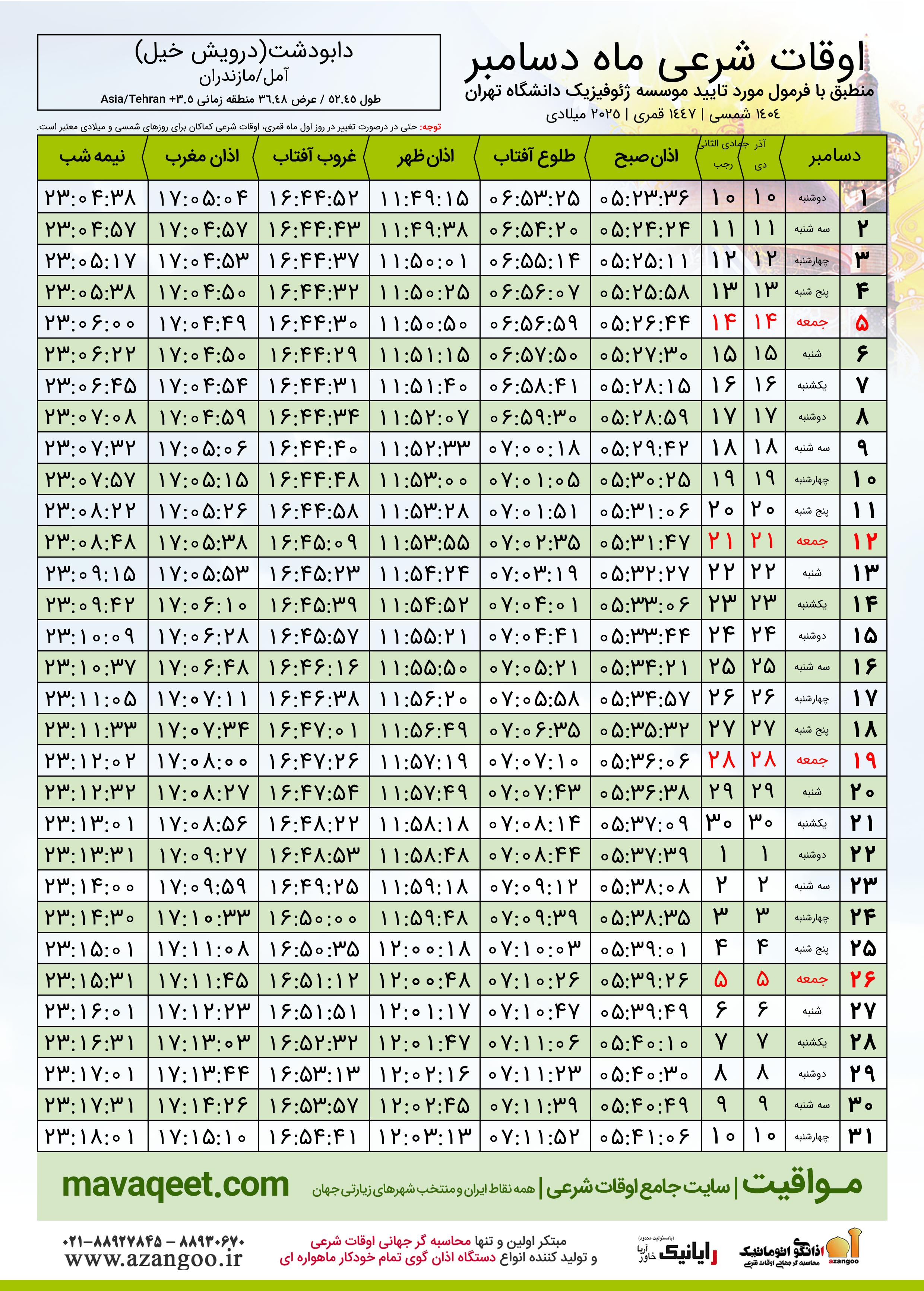 دانلود اوقات شرعی دسامبر ٢٠٢٥ شهر دابودشت(درویش خیل)