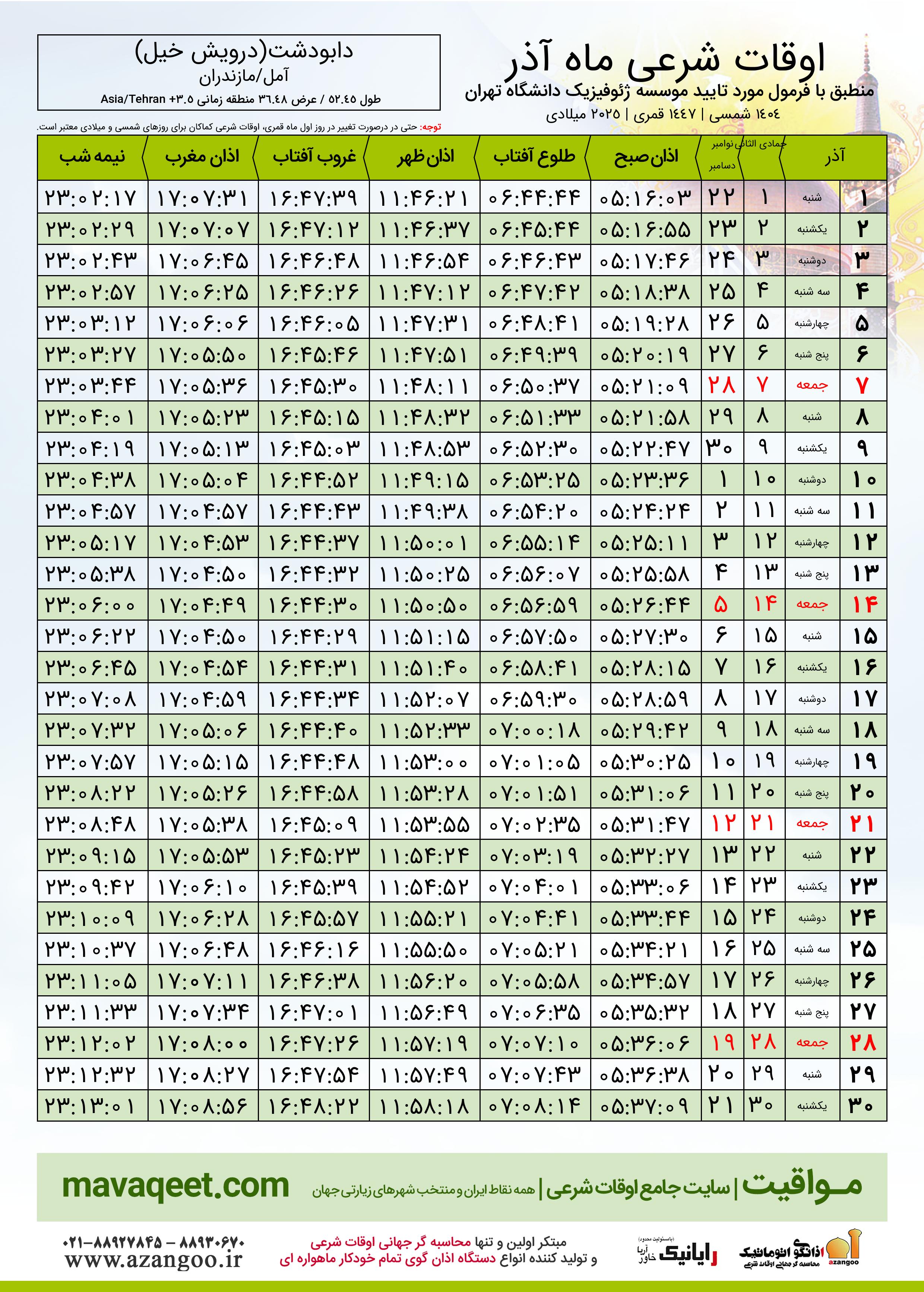 اوقات شرعی آذر ١٤٠٤ شمسی شهر دابودشت(درویش خیل)