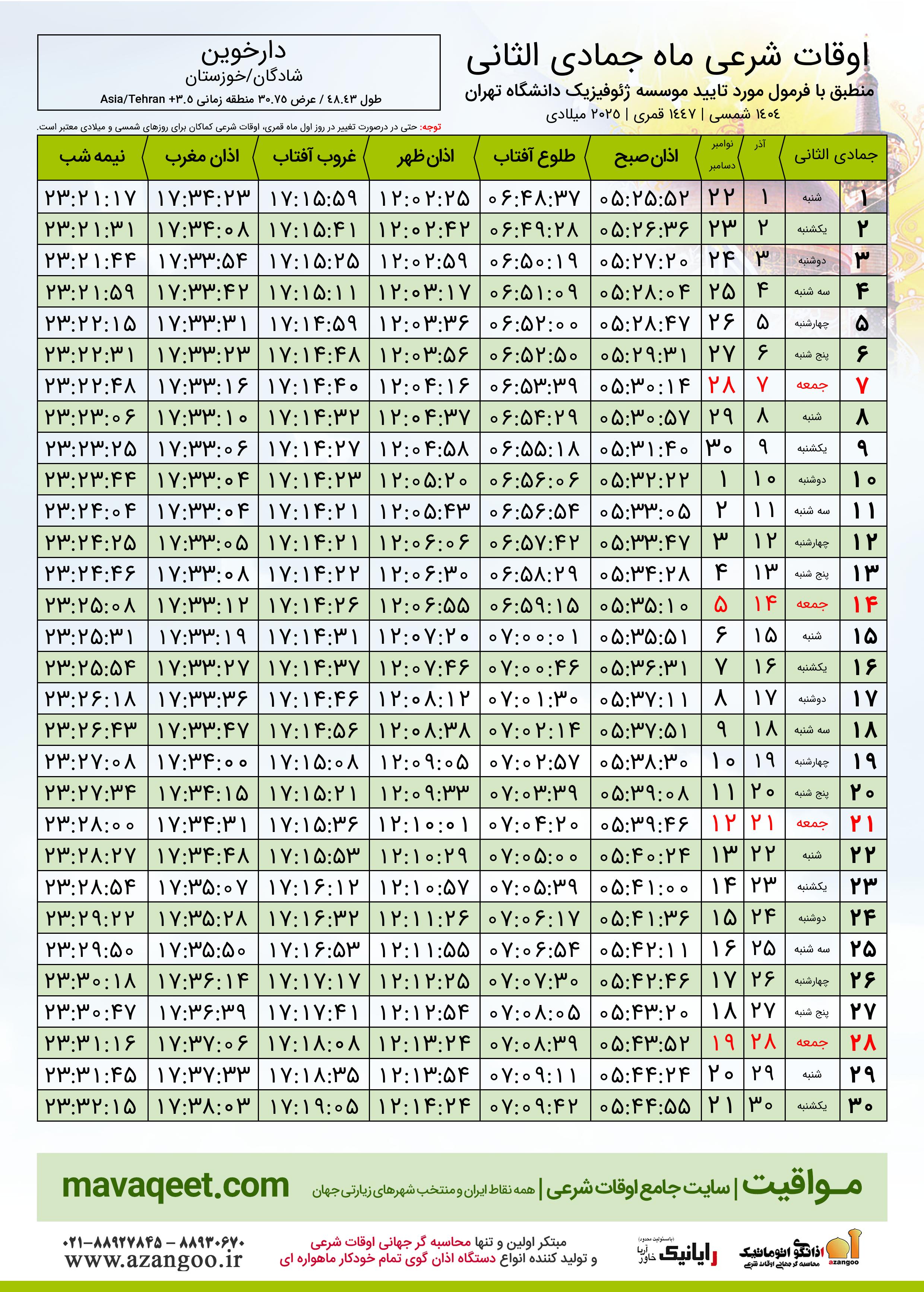 جدول اوقات شرعی جمادی الثانی ١٤٤٧ قمری شهر دارخوین