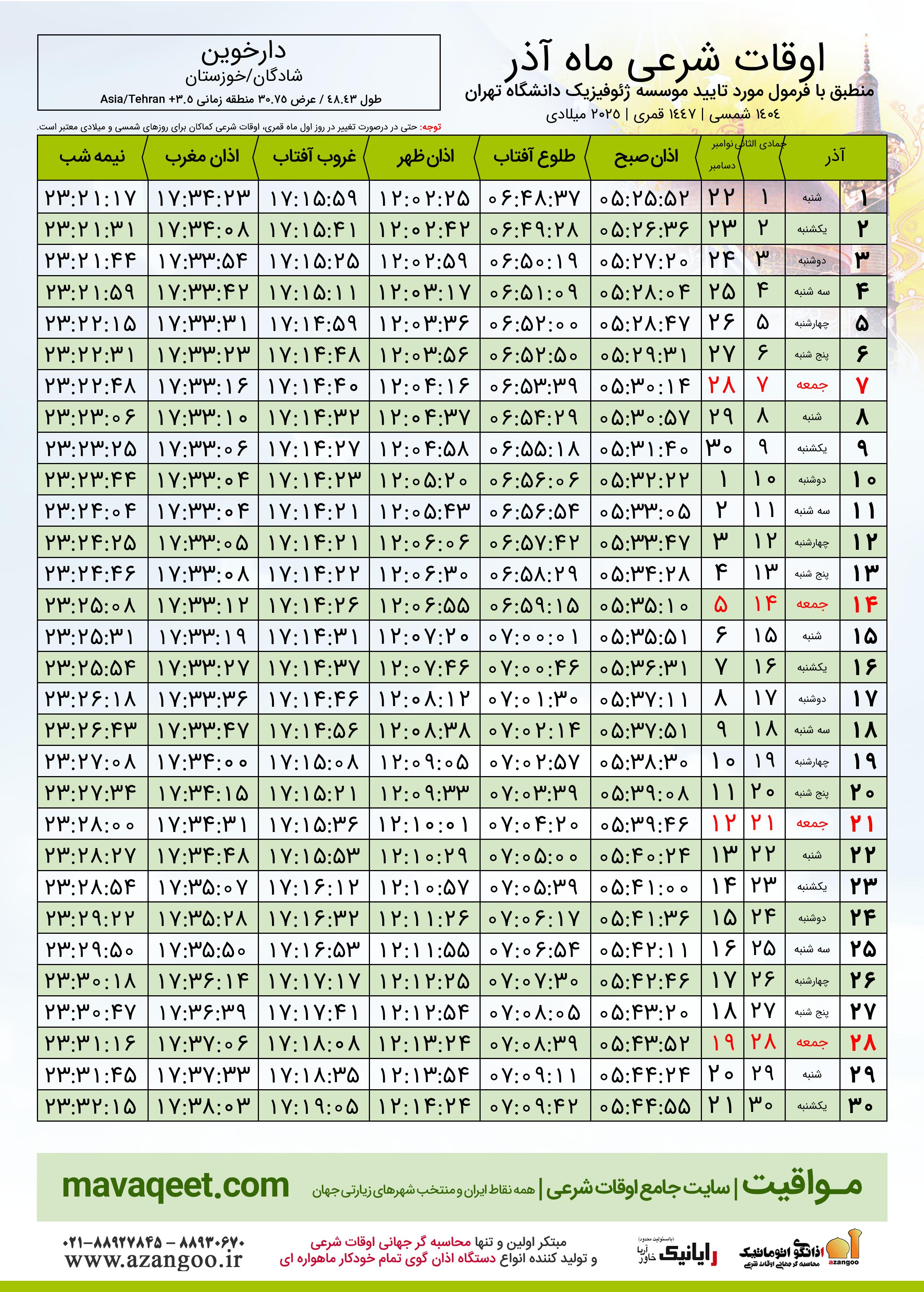 جدول اوقات شرعی آذر ١٤٠٤ شمسی شهر دارخوین