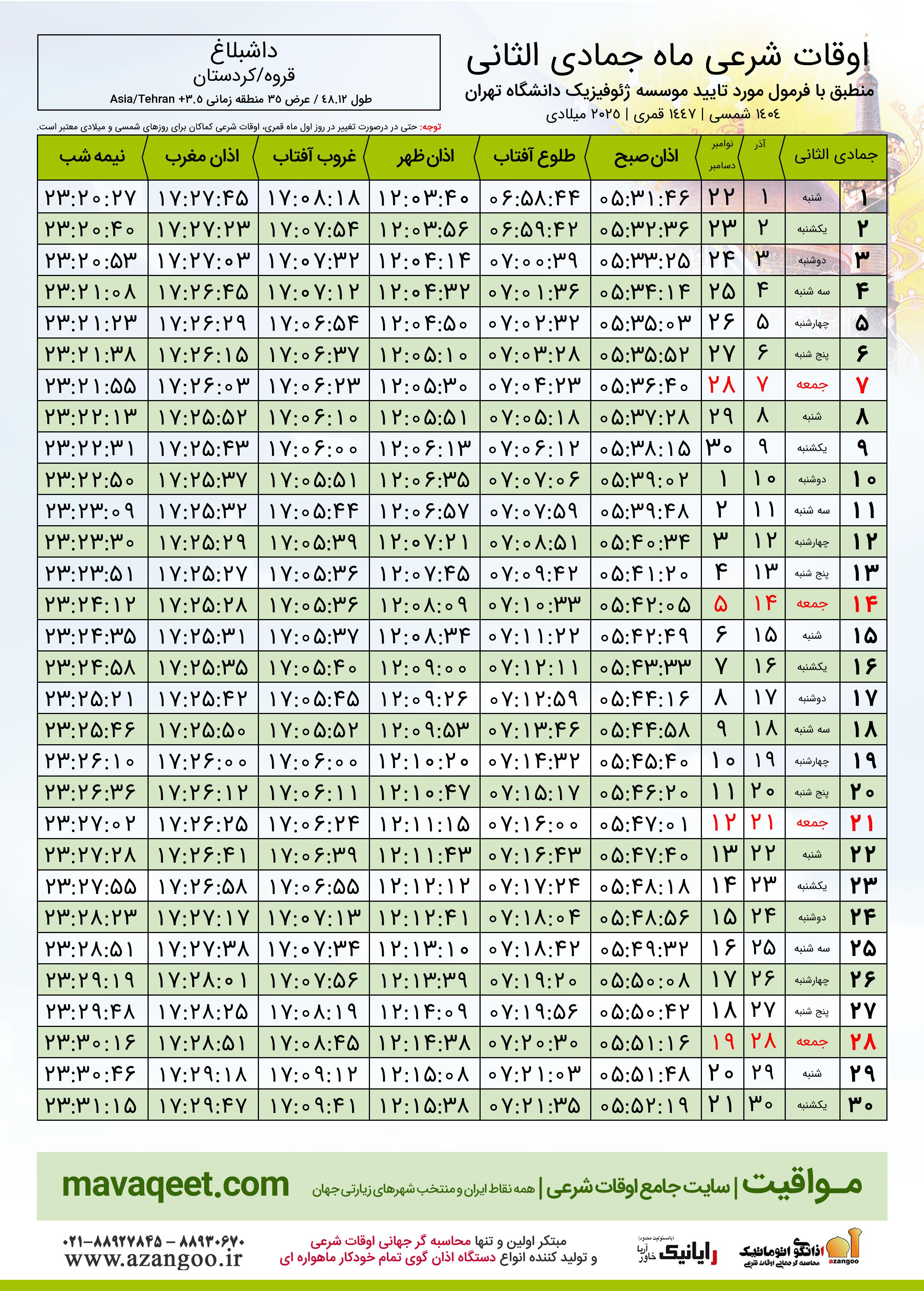 جدول اوقات شرعی جمادی الثانی ١٤٤٧ قمری شهر داشبلاغ