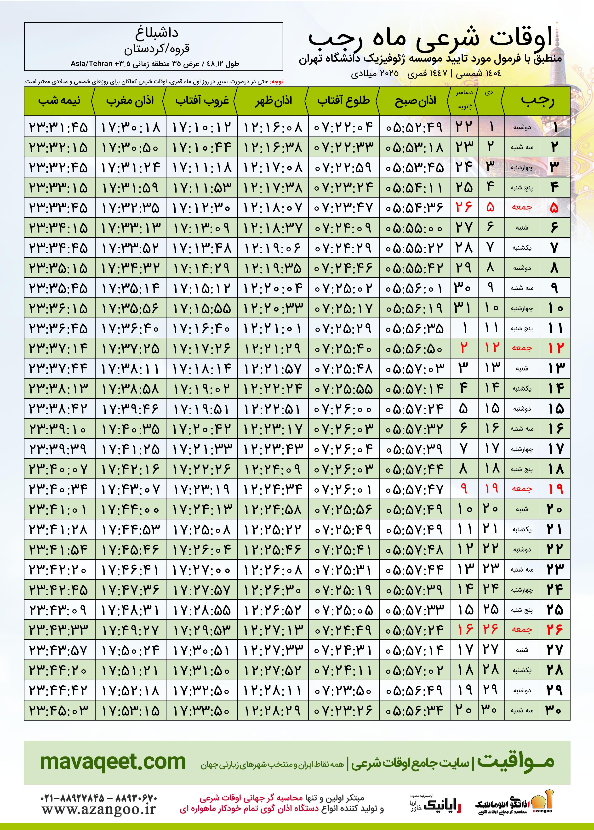 اوقات شرعی ماه رجب ١٤٤٧ هـ.ق شهر داشبلاغ بر