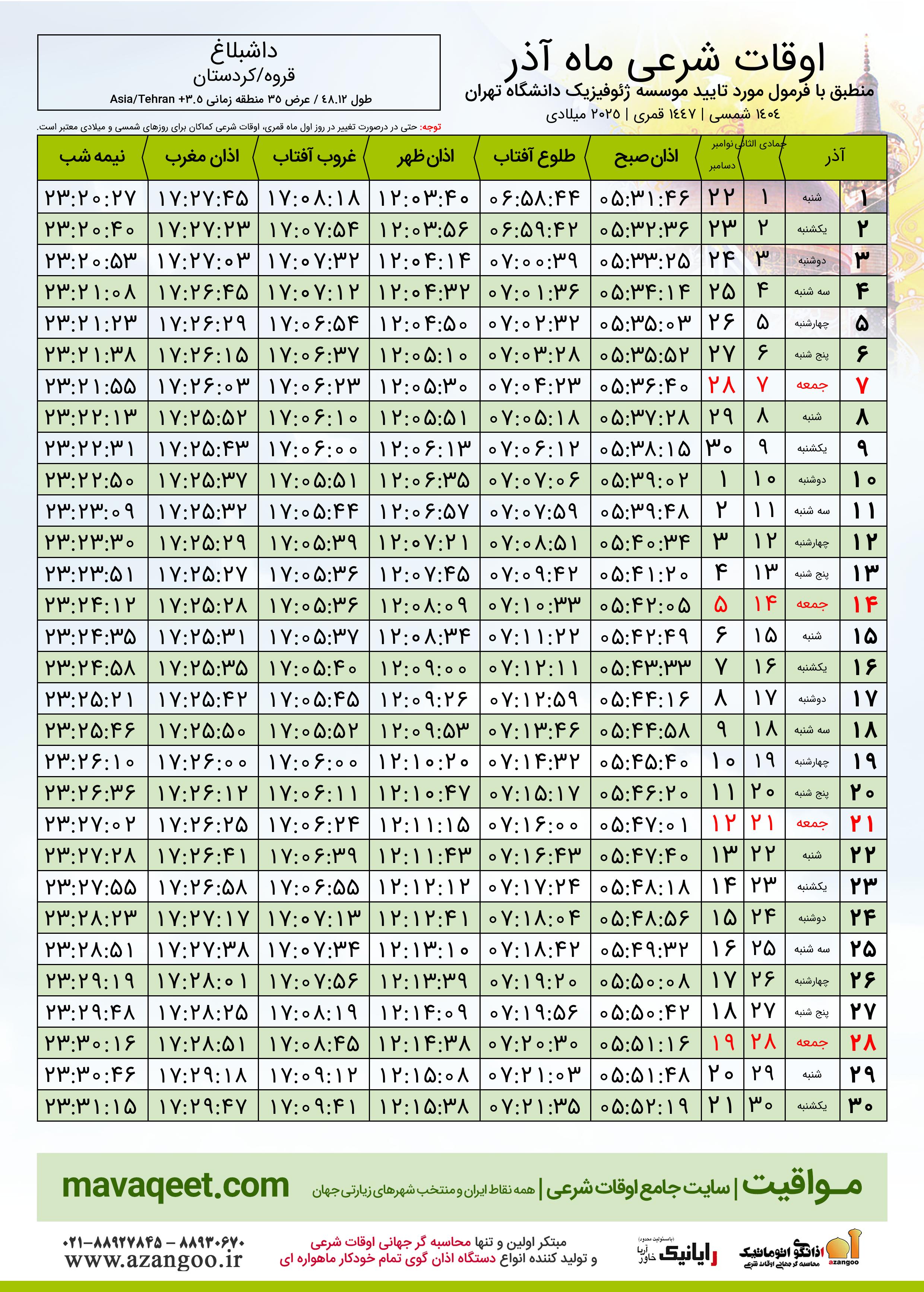 اوقات شرعی آذر ١٤٠٤ شمسی شهر داشبلاغ