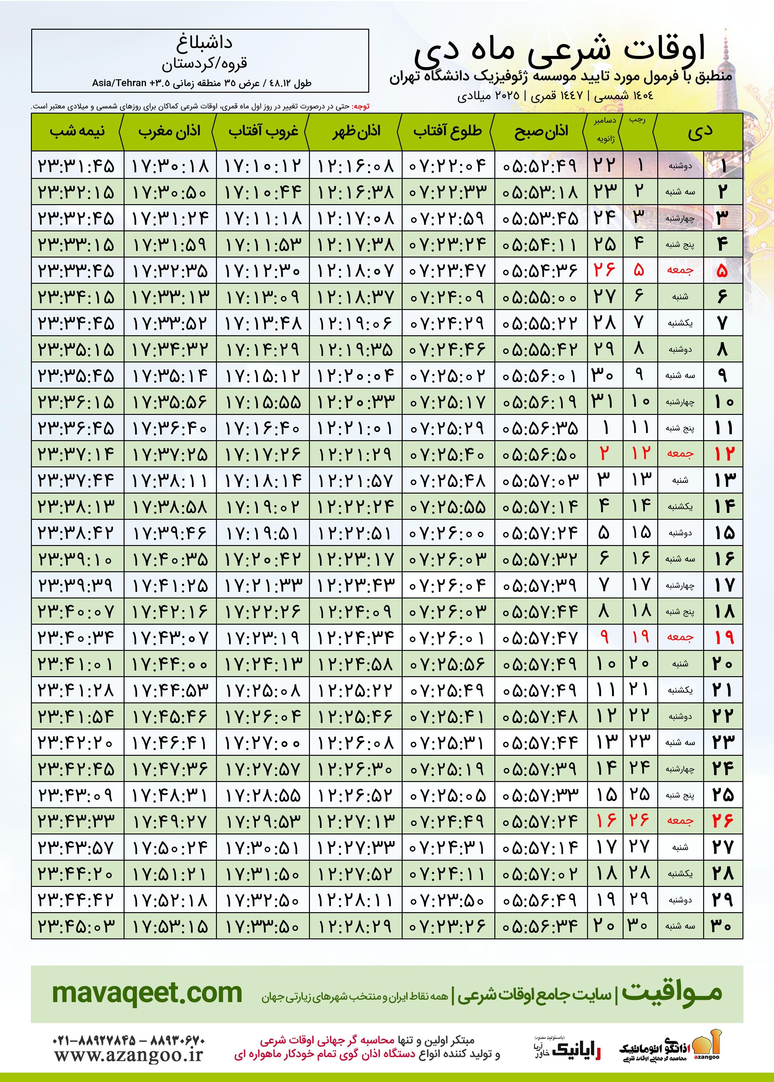 اوقات شرعی دی ١٤٠٤ شمسی شهر داشبلاغ