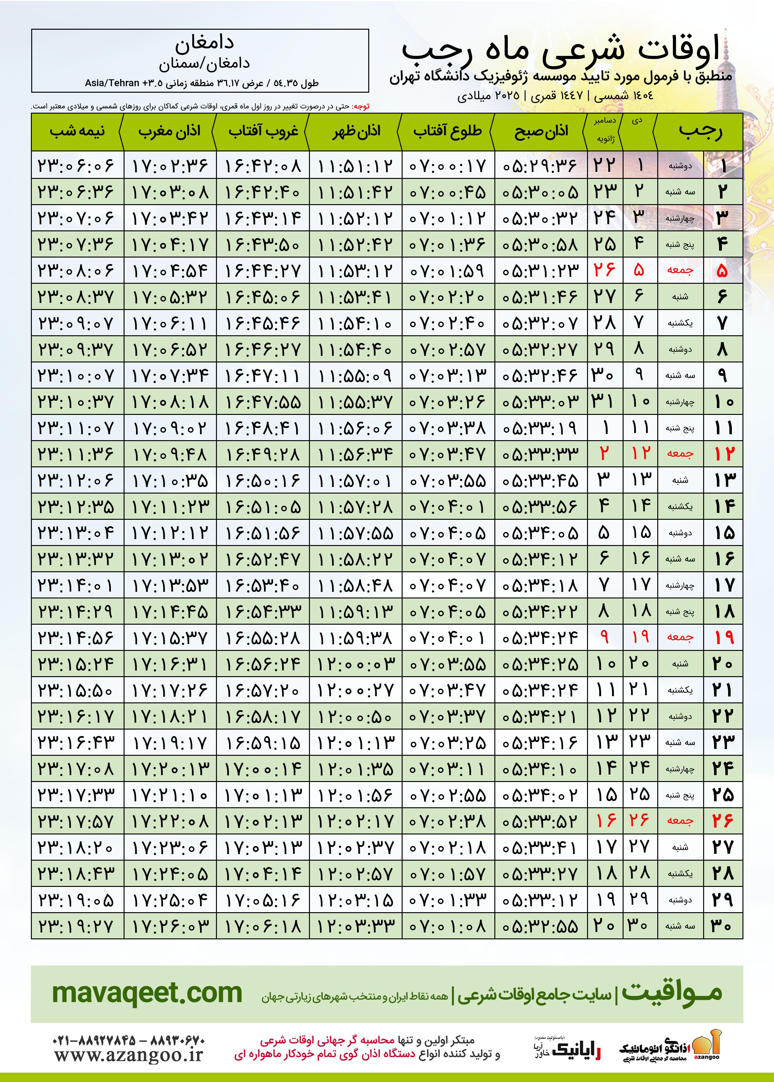اوقات شرعی ماه رجب ١٤٤٧ هـ.ق شهر دامغان بر