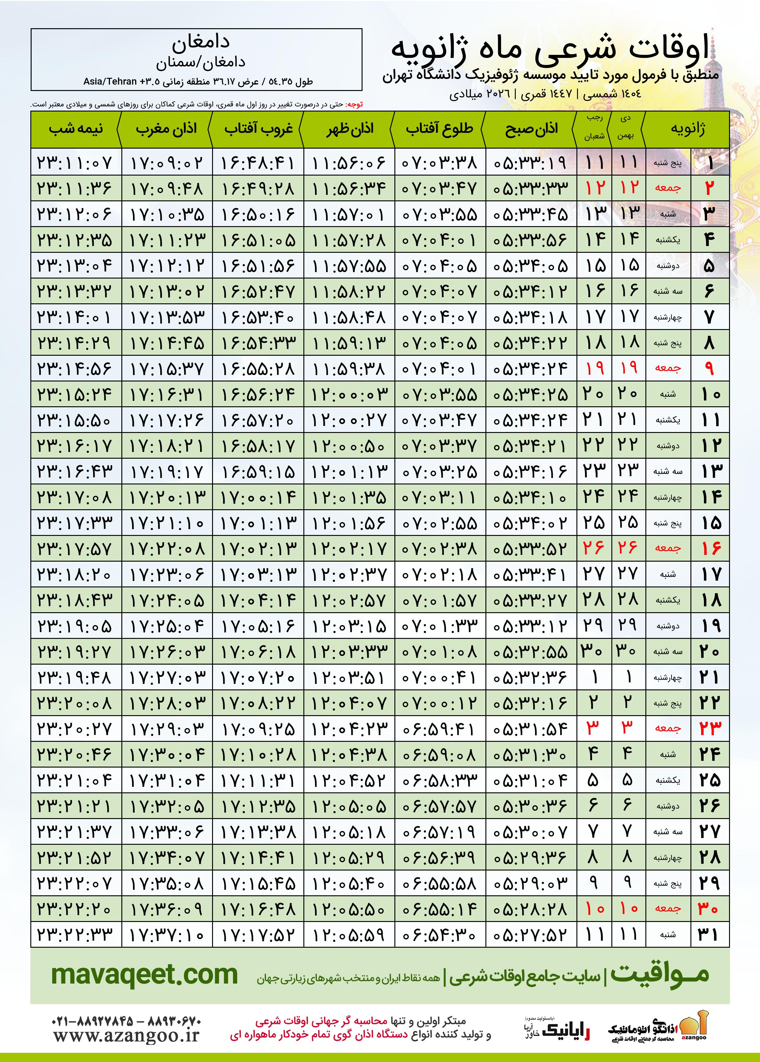 دانلود اوقات شرعی ژانویه ٢٠٢٦ شهر دامغان