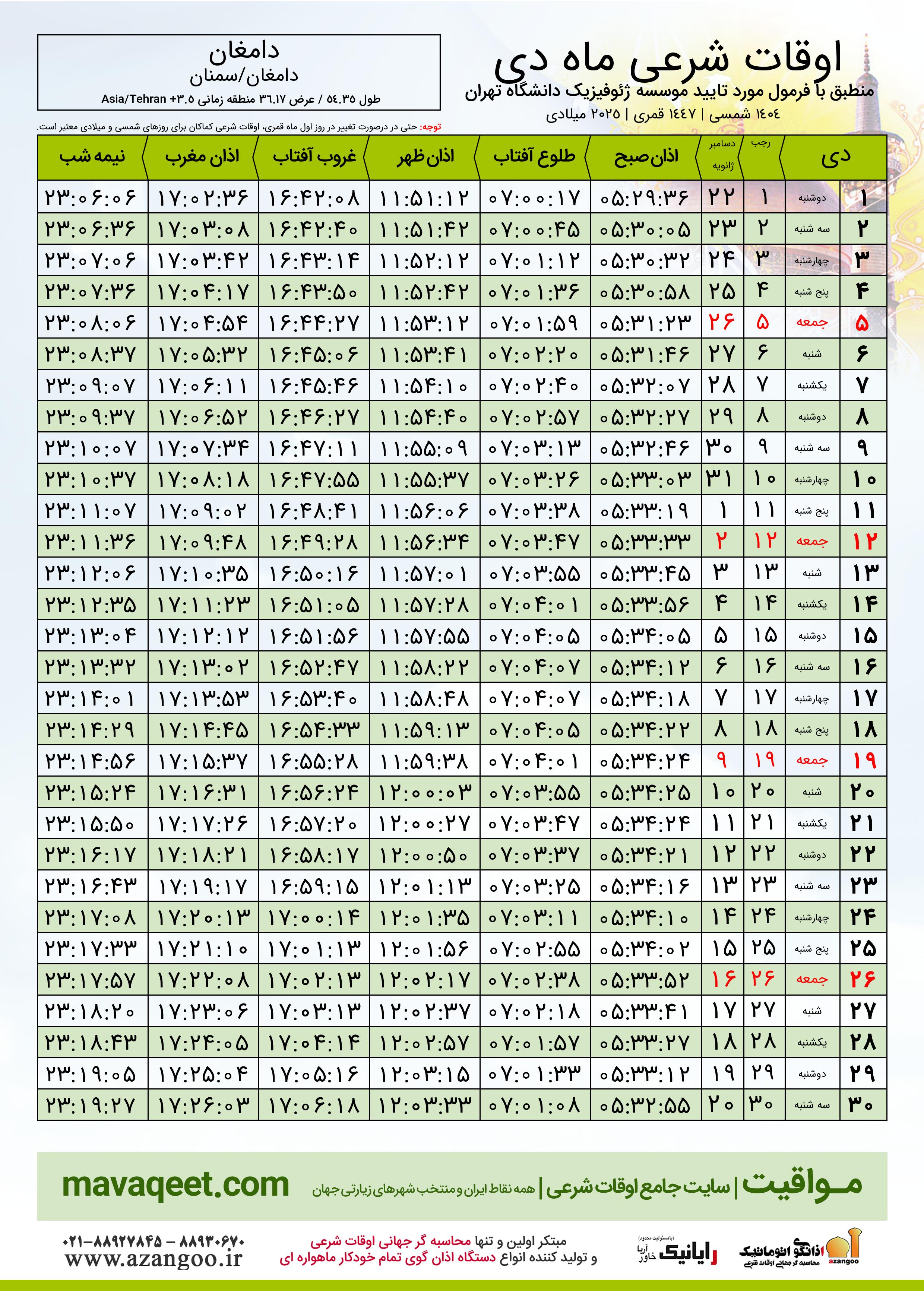 اوقات شرعی دی ١٤٠٤ شمسی شهر دامغان
