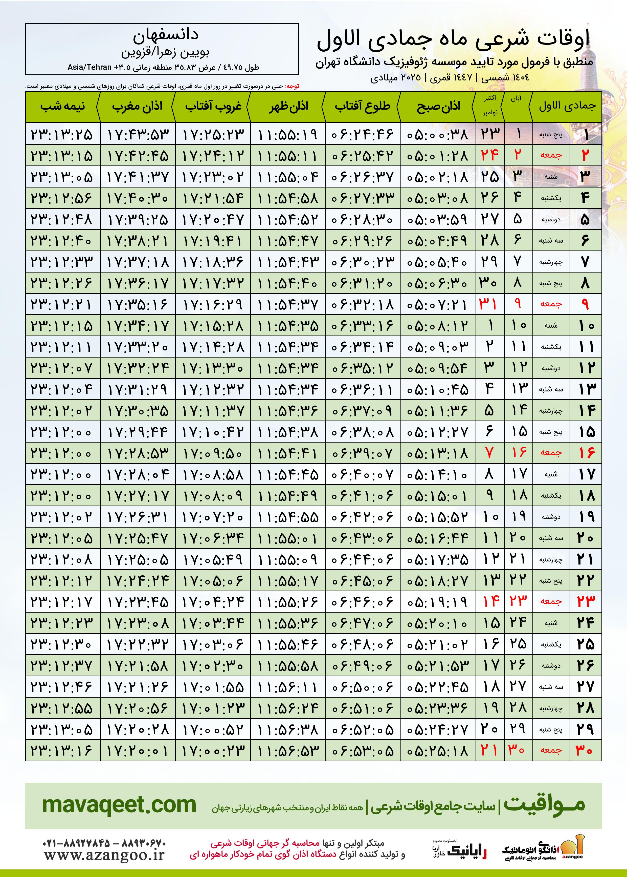 جدول اوقات شرعی جمادی الاول ١٤٤٧ قمری شهر دانسفهان