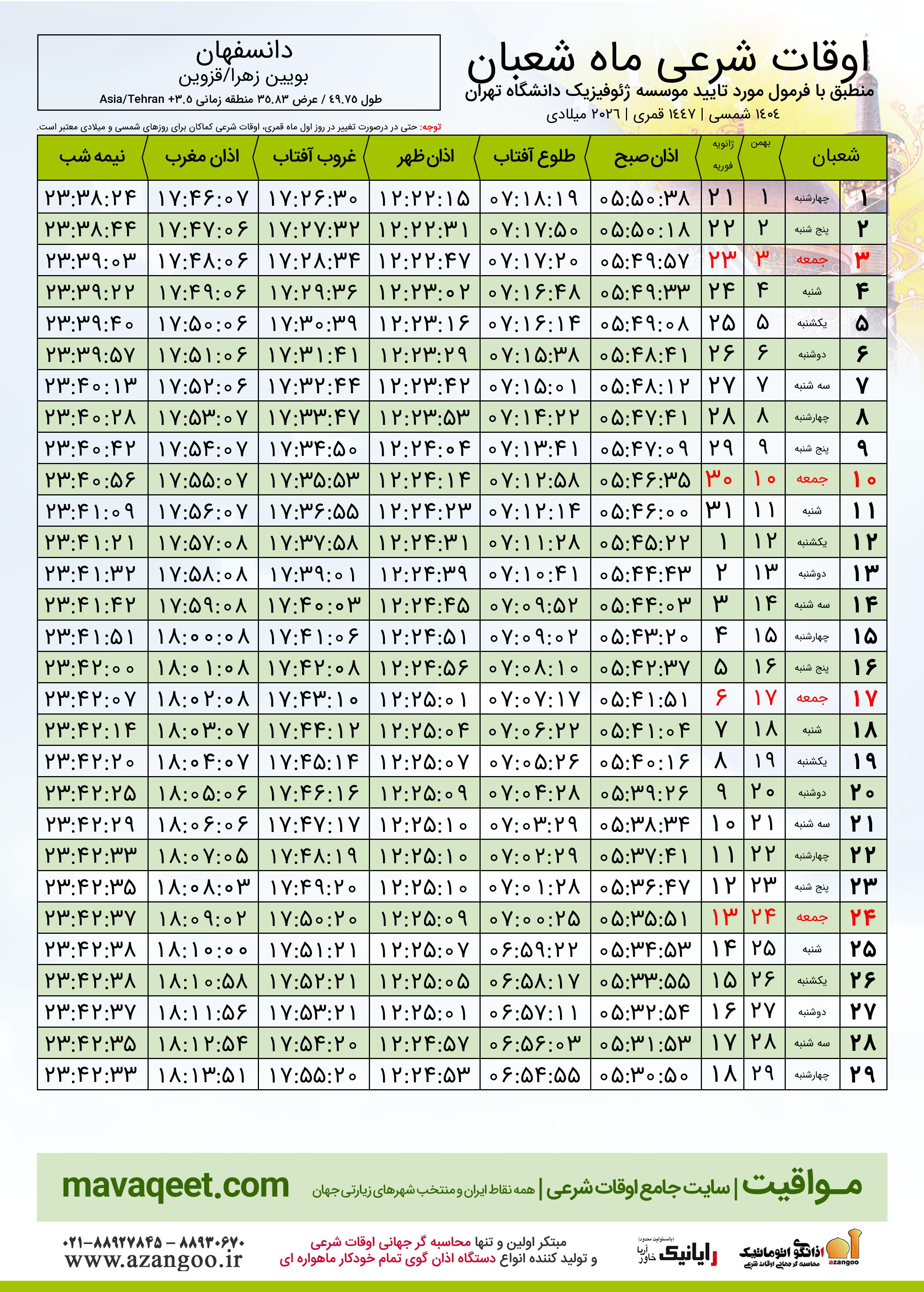 اوقات شرعی ماه شعبان ١٤٤٧ هـ.ق شهر دانسفهان بر