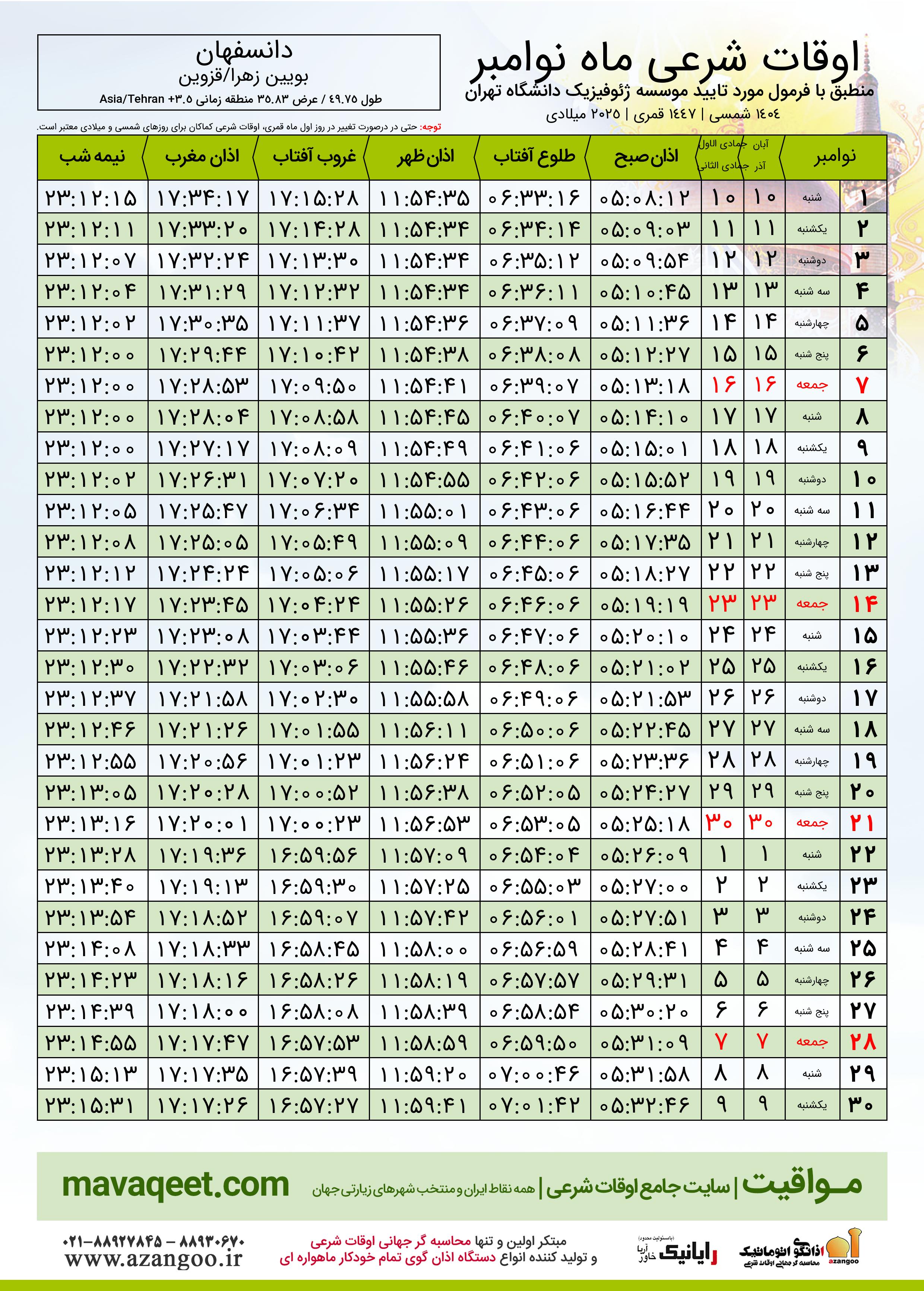 دانلود اوقات شرعی نوامبر ٢٠٢٥ شهر دانسفهان