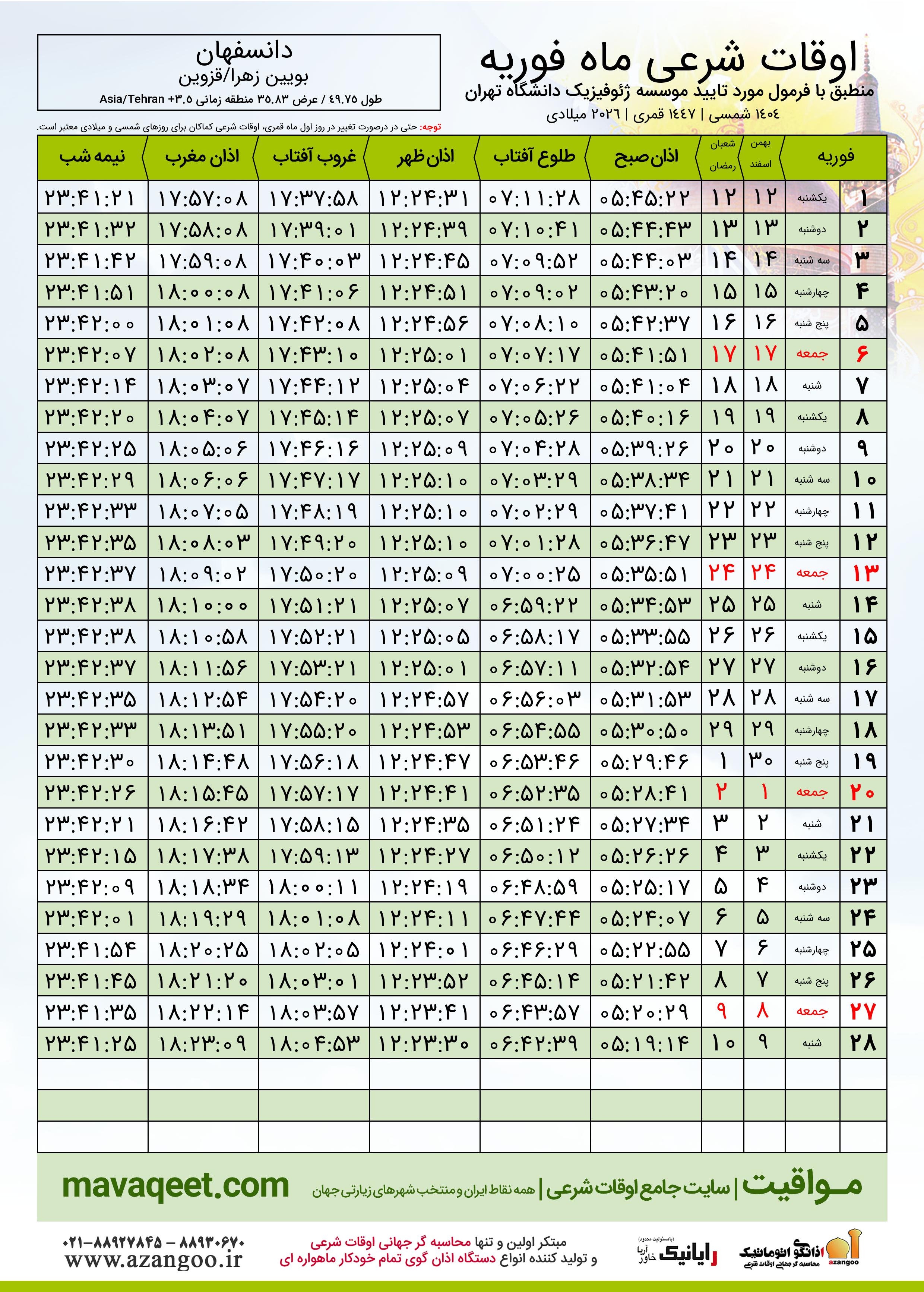 دانلود اوقات شرعی فوریه ٢٠٢٦ شهر دانسفهان