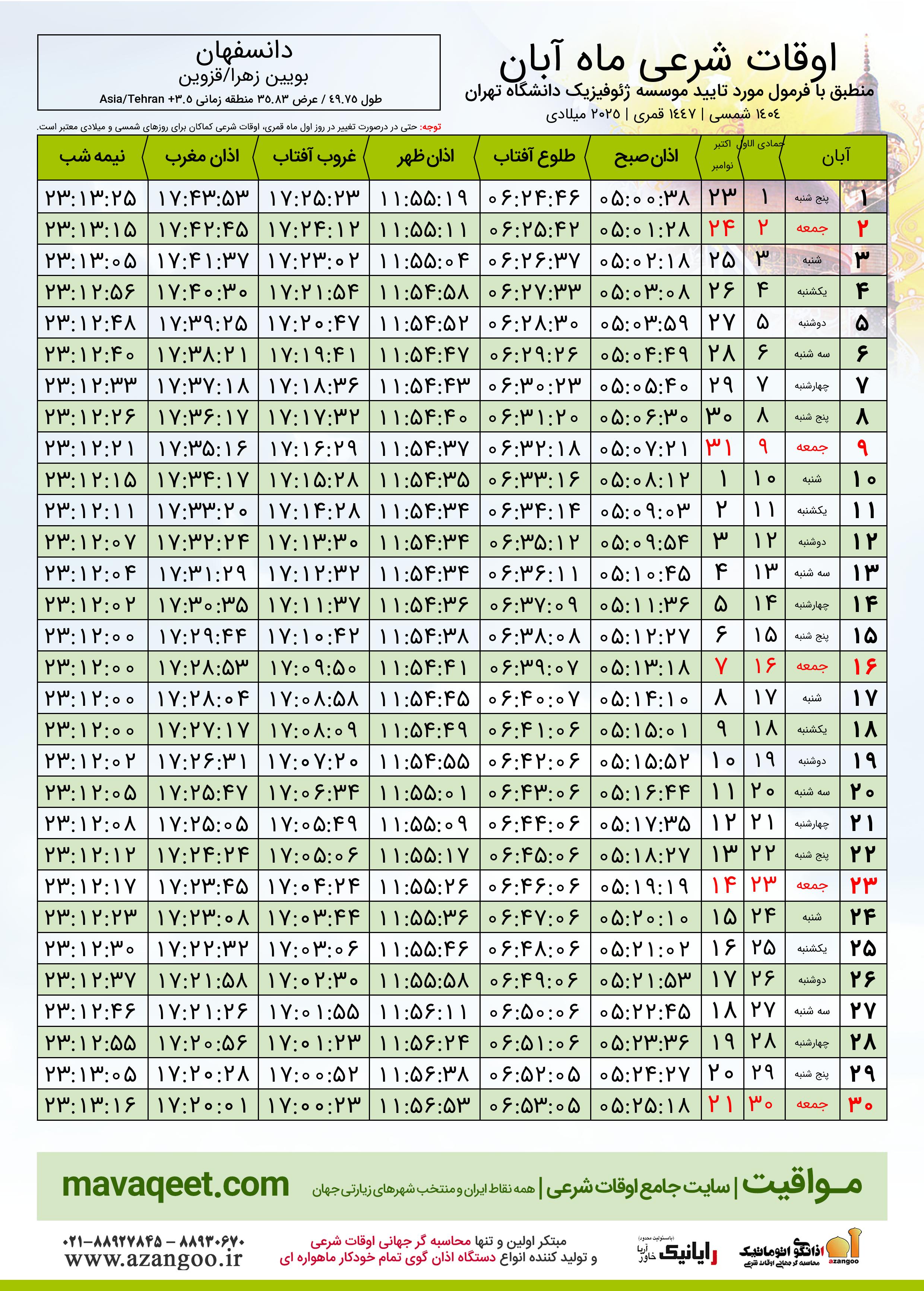 جدول اوقات شرعی آبان ١٤٠٤ شمسی شهر دانسفهان