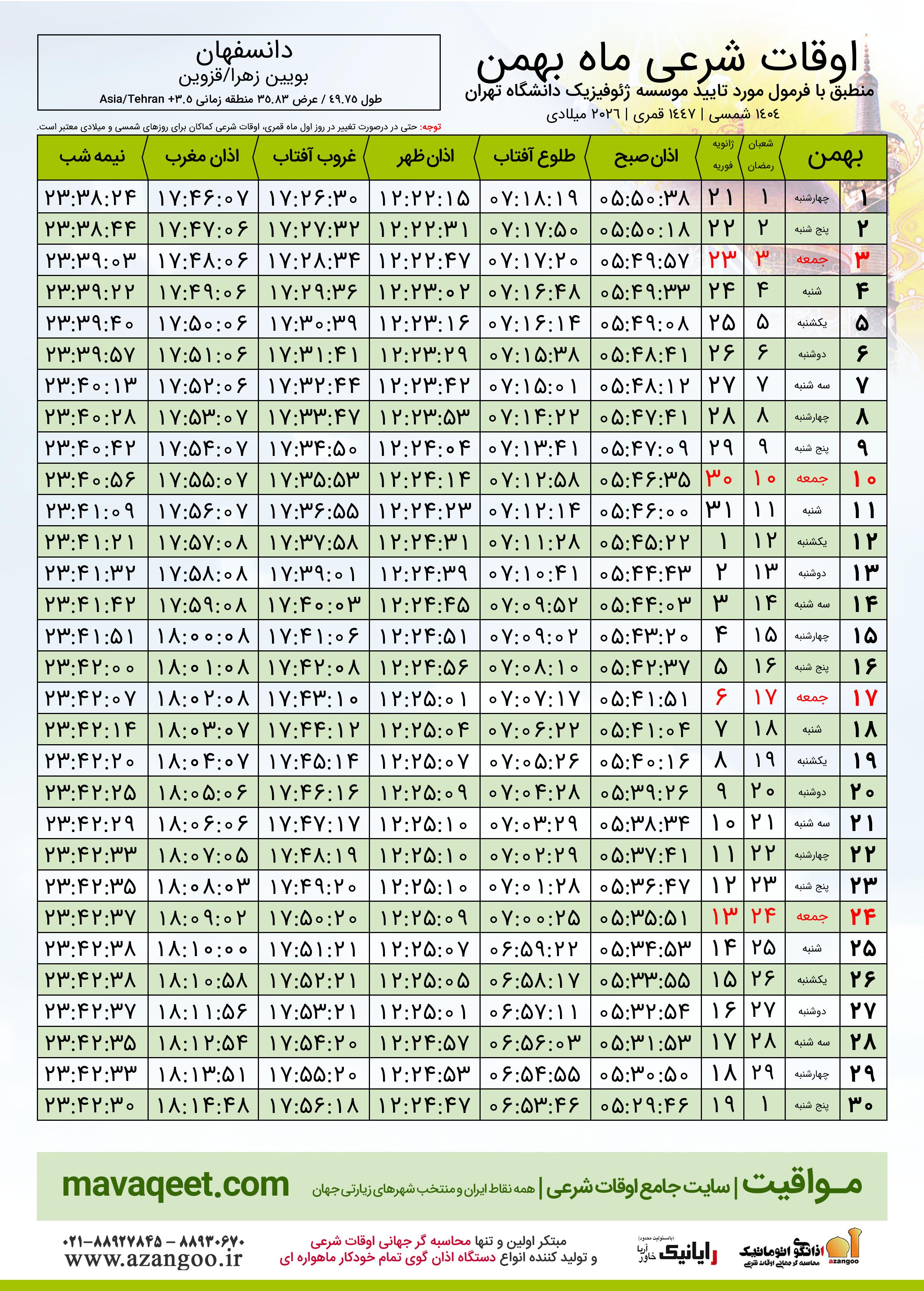 دانلود اوقات شرعی بهمن ٠٤ - ١٤٠٤ شهر دانسفهان