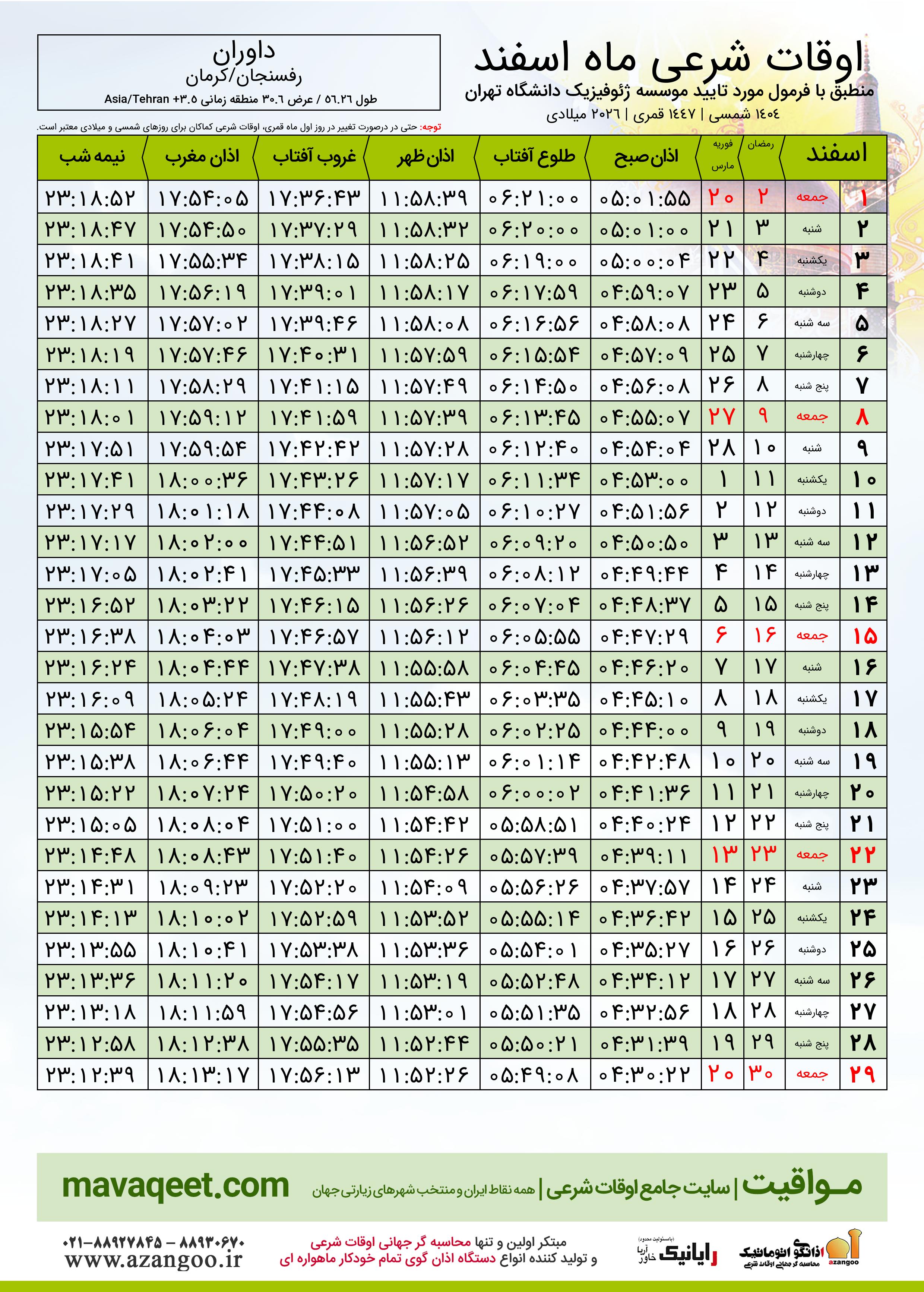 دانلود اوقات شرعی ماه رمضان ٠٤ - ١٤٠٤ شمسی | ٢٠٢٦ میلادی | ١٤٤٧ قمری شهر داوران