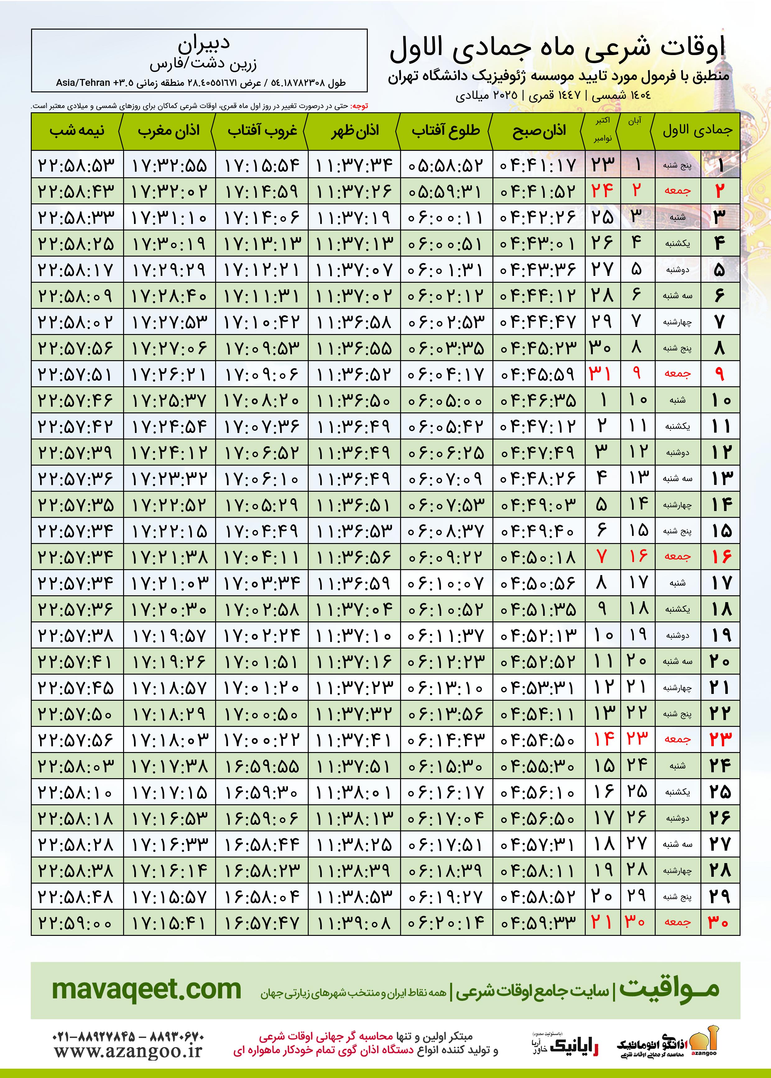 جدول اوقات شرعی جمادی الاول ١٤٤٧ قمری شهر دبیران