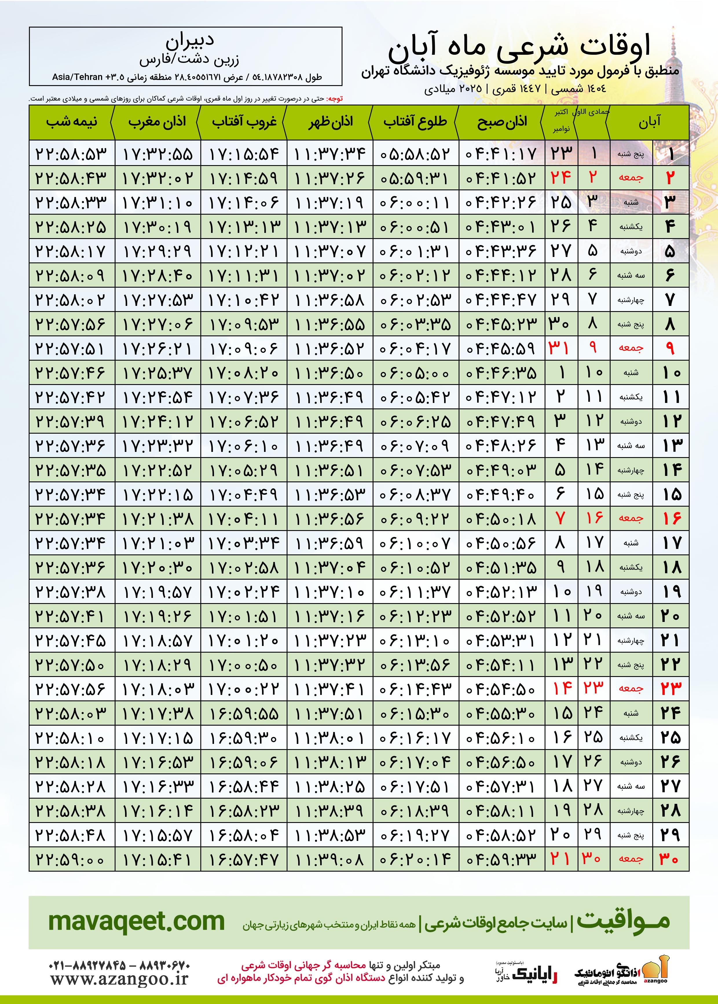 اوقات شرعی آبان ١٤٠٤ شمسی شهر دبیران