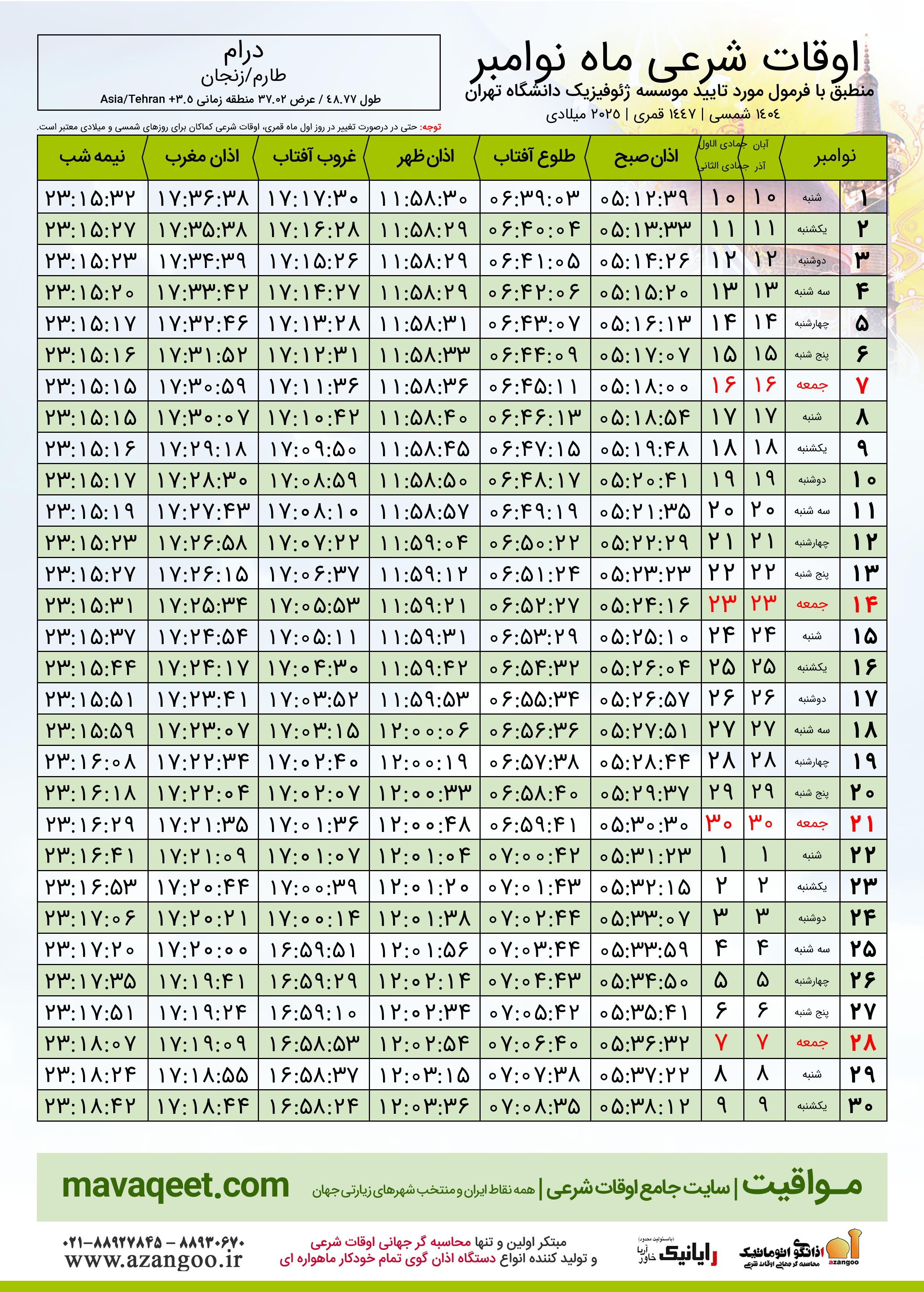 جدول اوقات شرعی نوامبر ٢٠٢٥ میلادی شهر درام