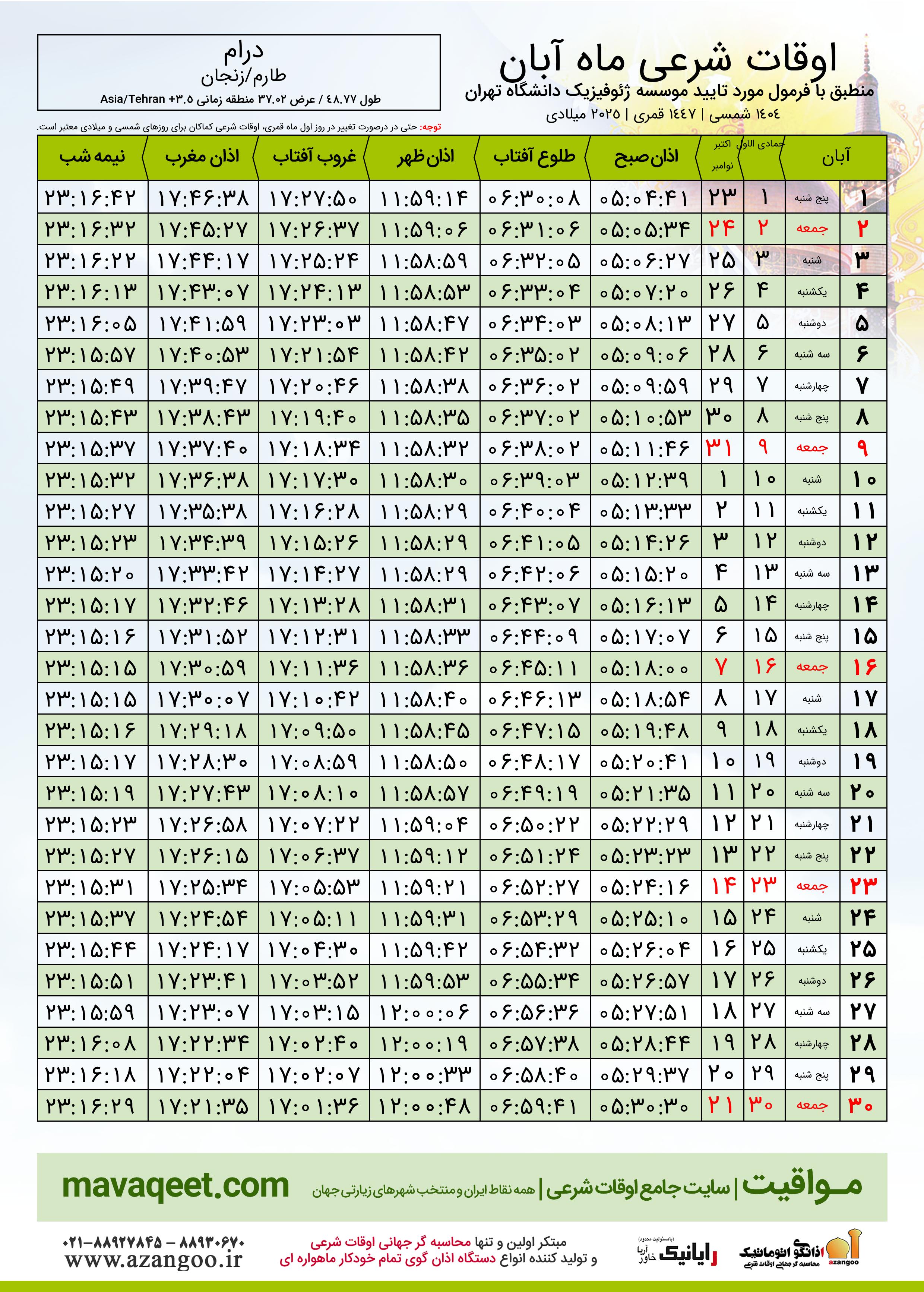 اوقات شرعی آبان ١٤٠٤ شمسی شهر درام