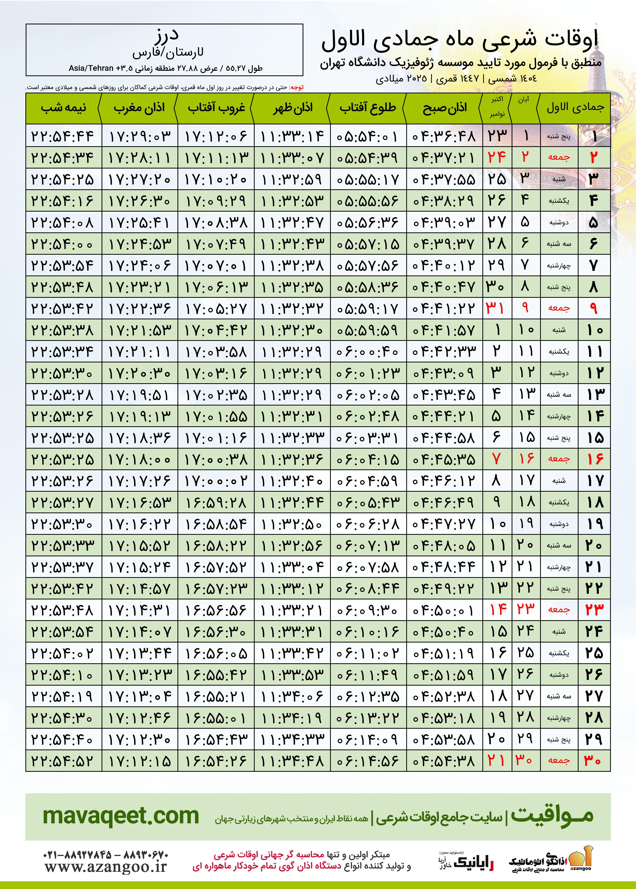 اوقات شرعی ماه جمادی الاول ١٤٤٧ هـ.ق شهر درز بر