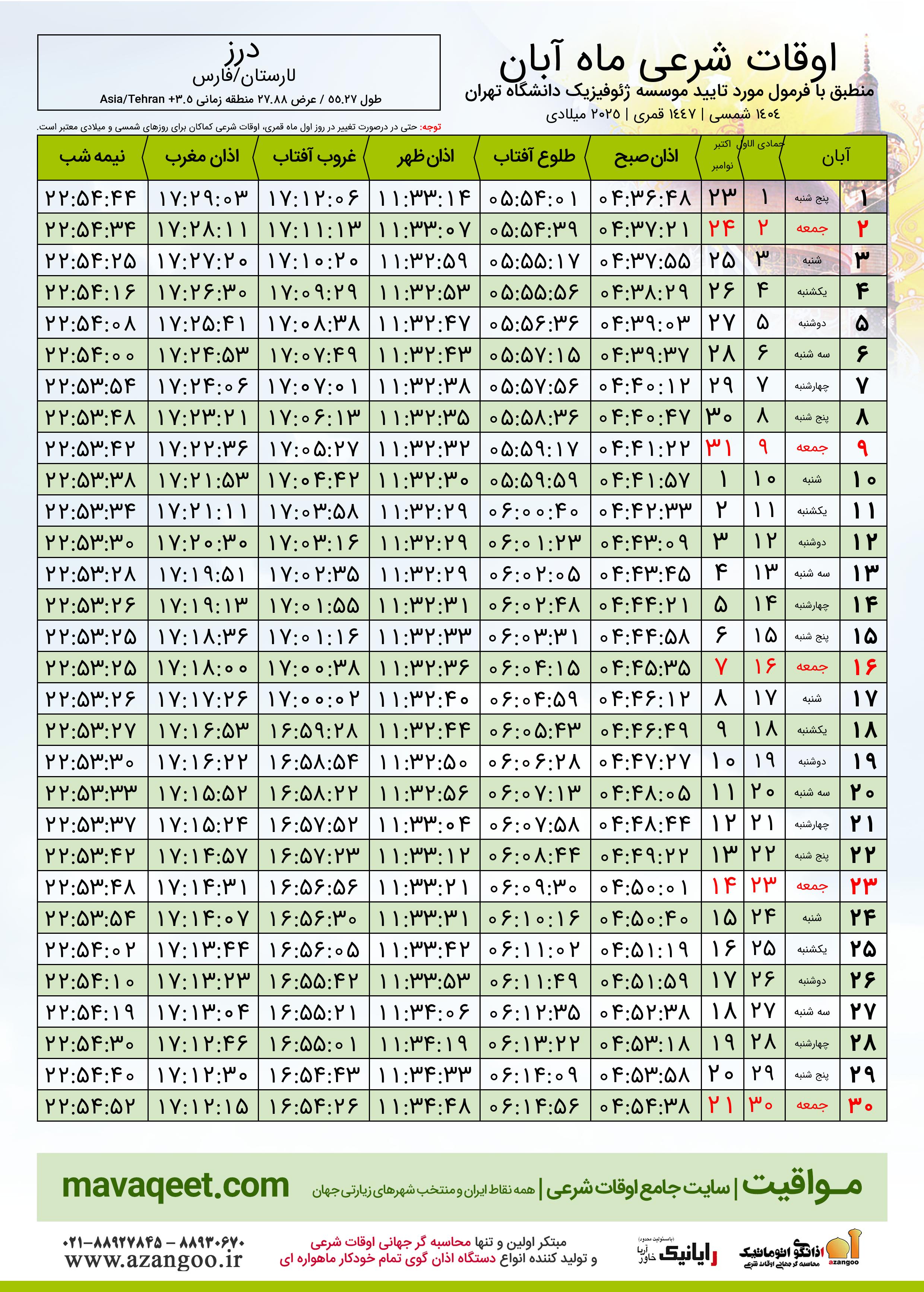 جدول اوقات شرعی آبان ١٤٠٤ شمسی شهر درز