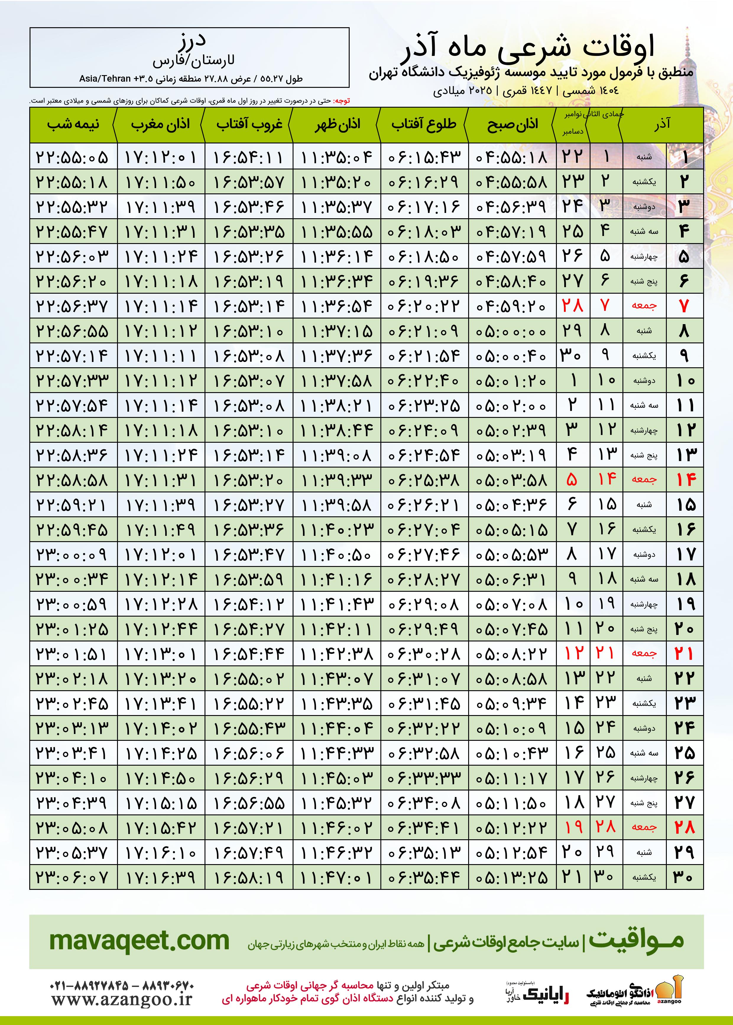 اوقات شرعی آذر ١٤٠٤ شمسی شهر درز