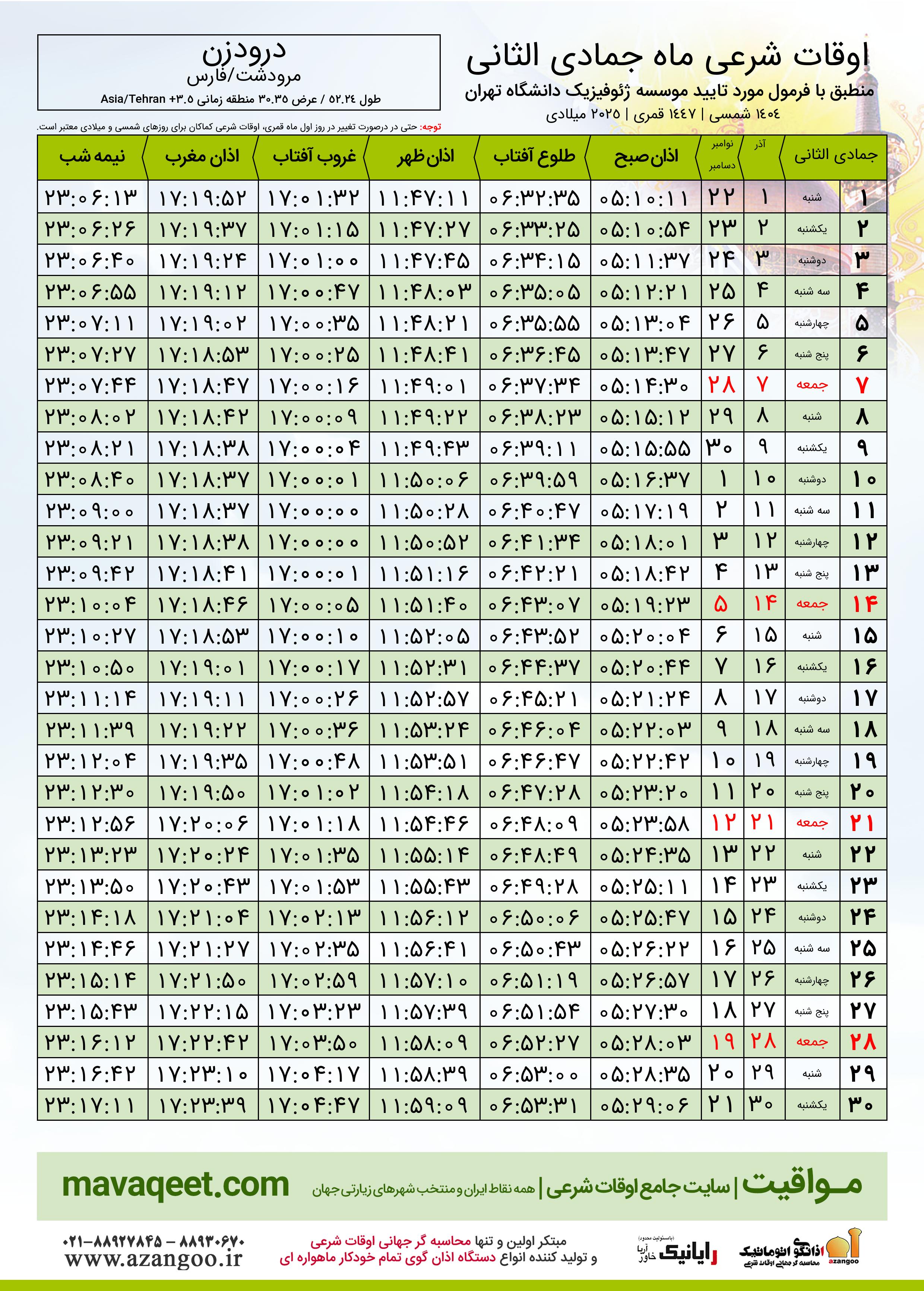 جدول اوقات شرعی جمادی الثانی ١٤٤٧ قمری شهر درودزن