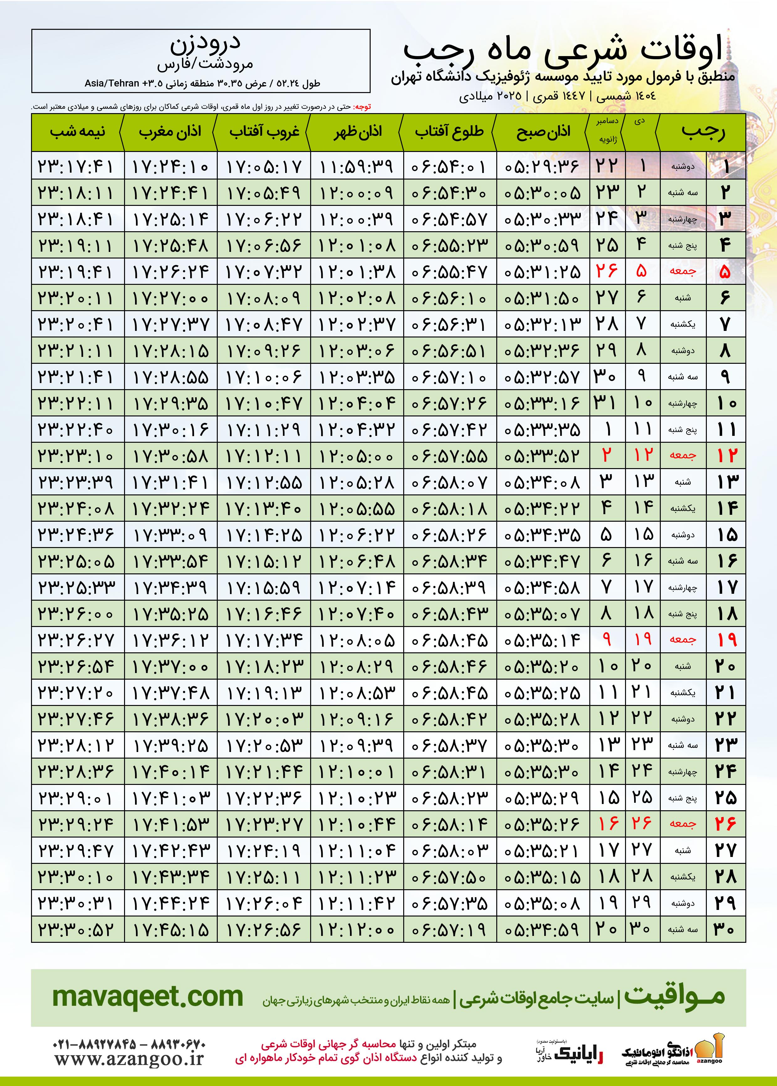 اوقات شرعی ماه رجب ١٤٤٧ هـ.ق شهر درودزن بر