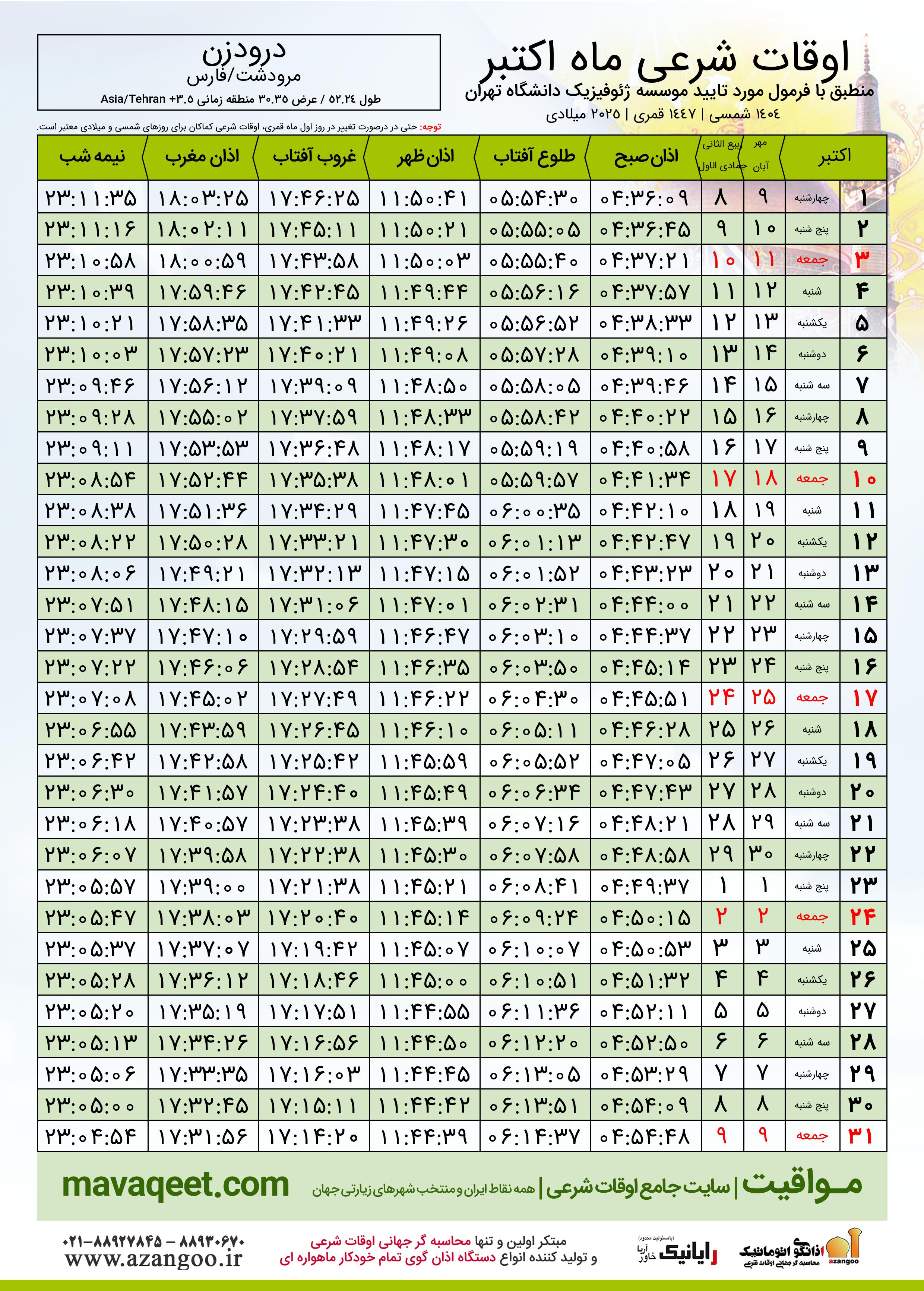 جهت نمایش تصویر جدول اوقات شرعی جدول اوقات شرعی اکتبر ٢٠٢٥ میلادی شهر درودزن شهر درودزن در اندازه
