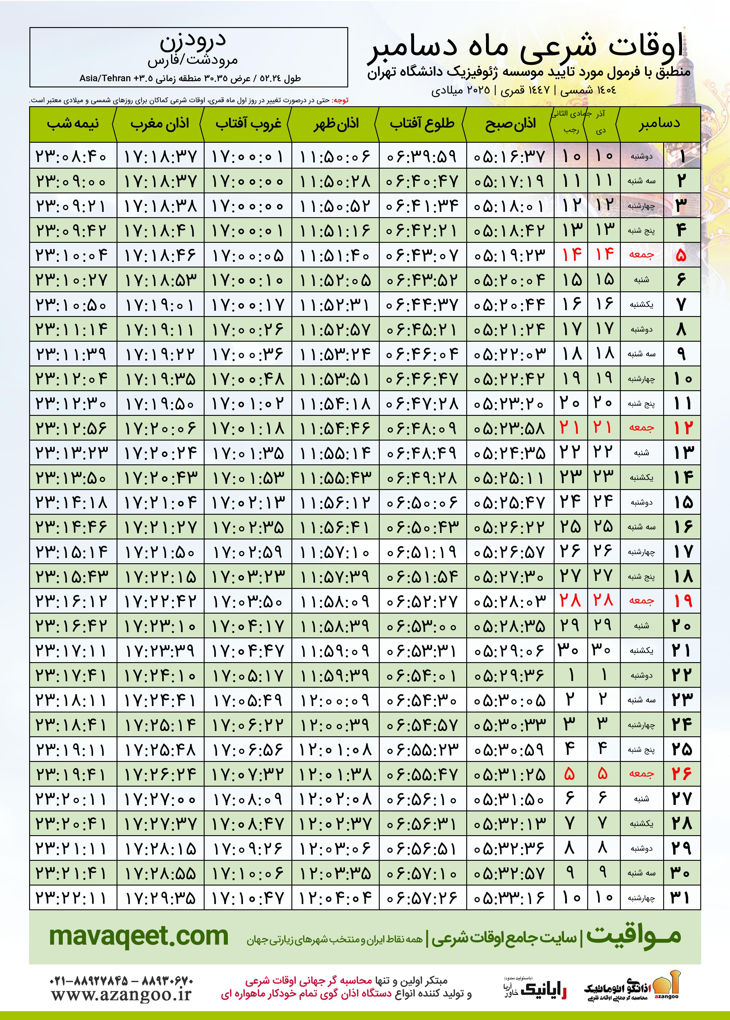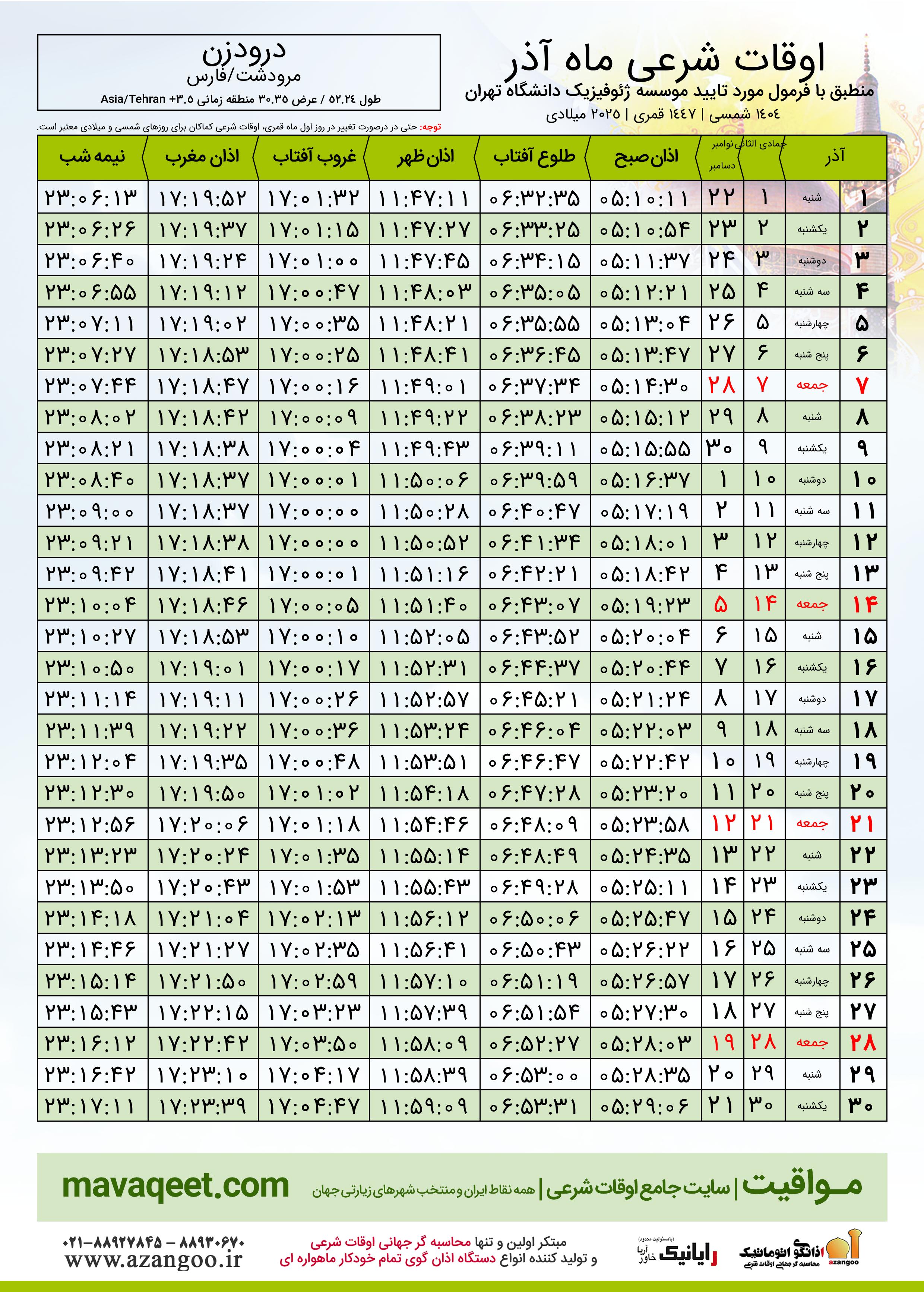 جدول اوقات شرعی آذر ١٤٠٤ شمسی شهر درودزن