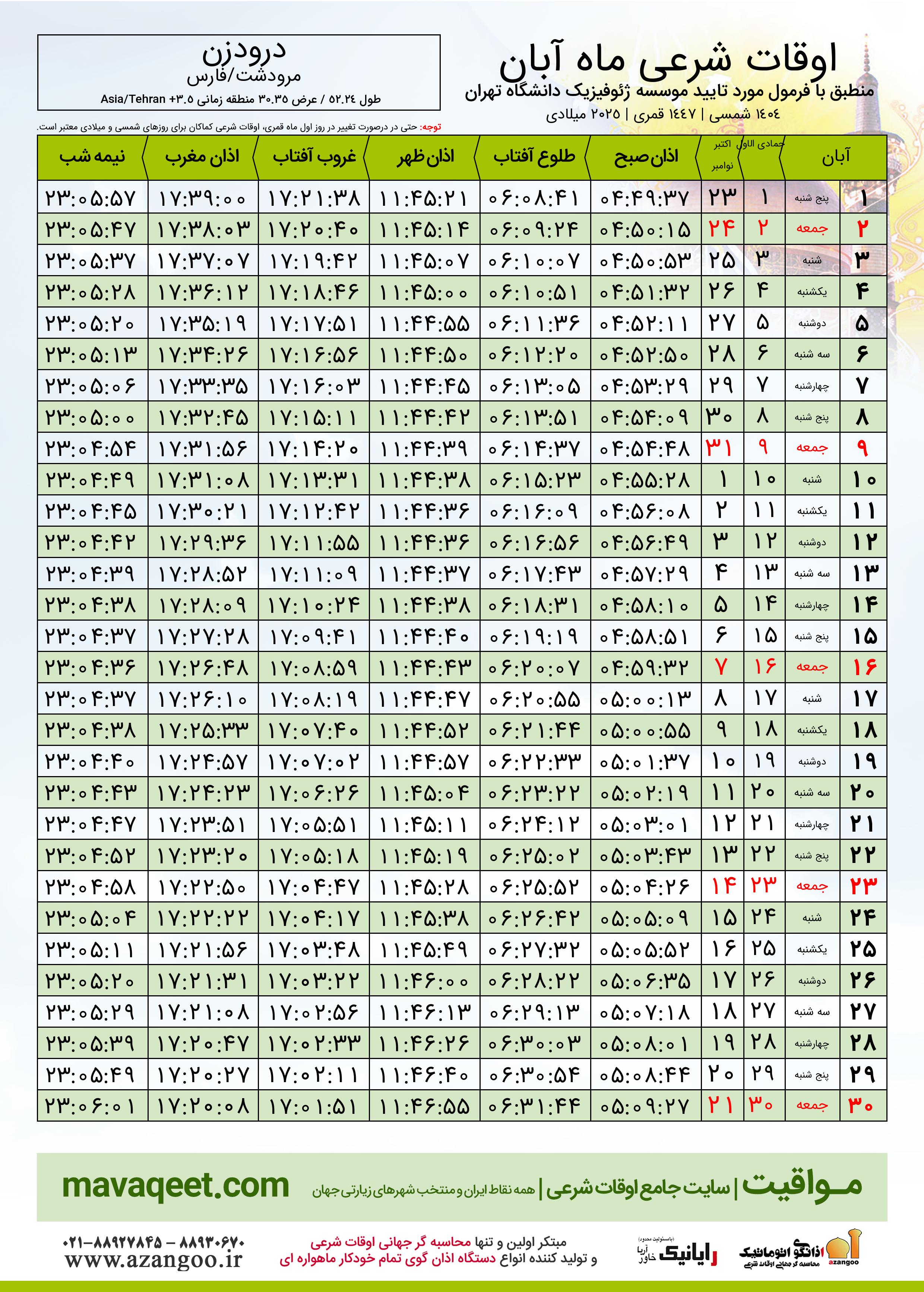 جدول اوقات شرعی آبان ١٤٠٤ شمسی شهر درودزن