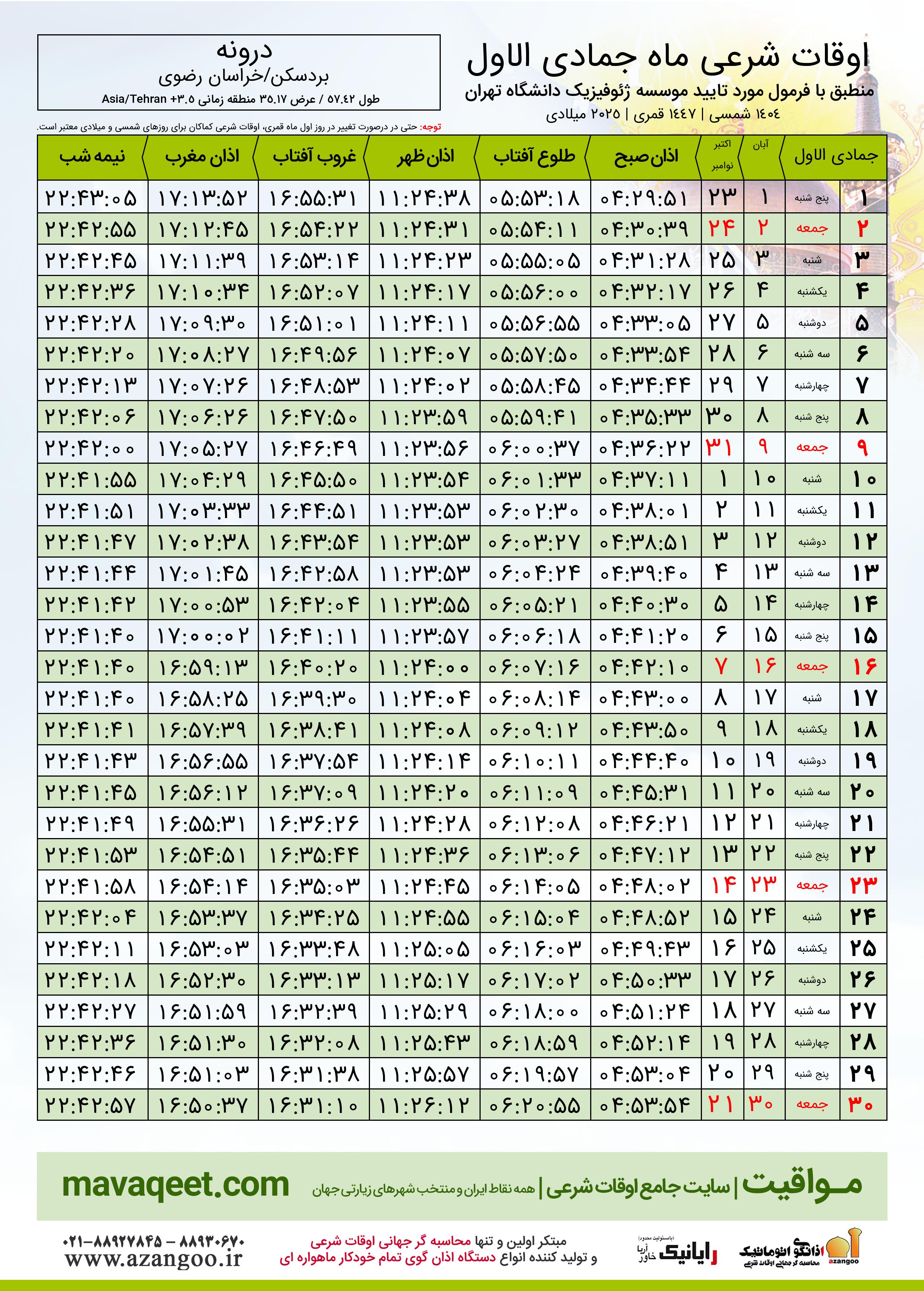 اوقات شرعی ماه جمادی الاول ١٤٤٧ هـ.ق شهر درونه بر