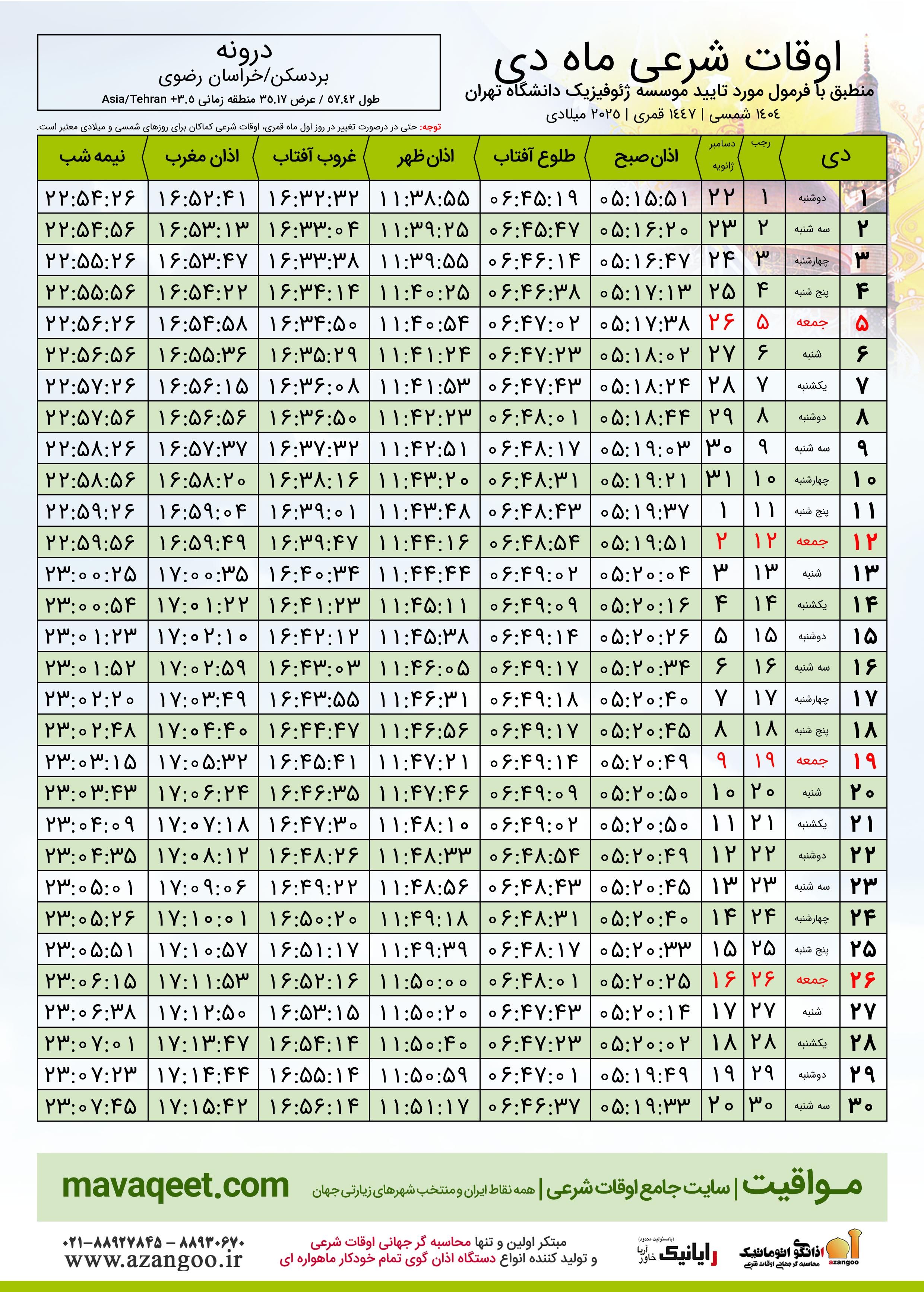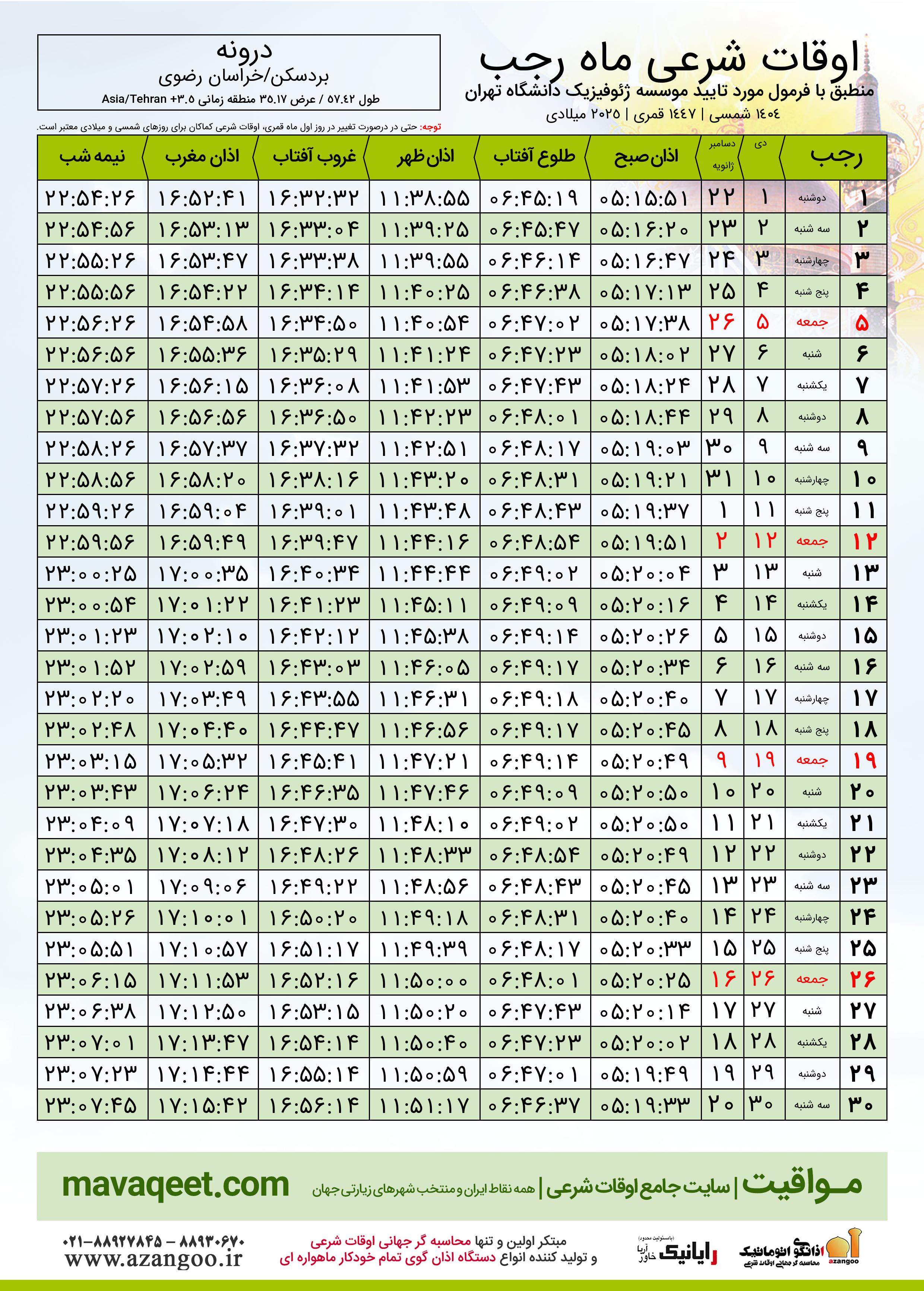 اوقات شرعی ماه رجب ١٤٤٧ هـ.ق شهر درونه بر