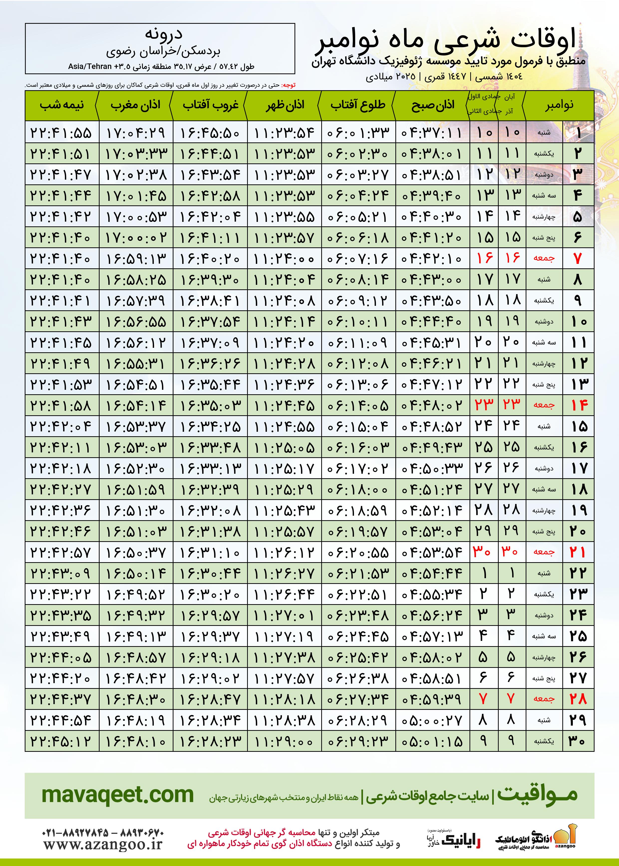 جدول اوقات شرعی نوامبر ٢٠٢٥ میلادی شهر درونه